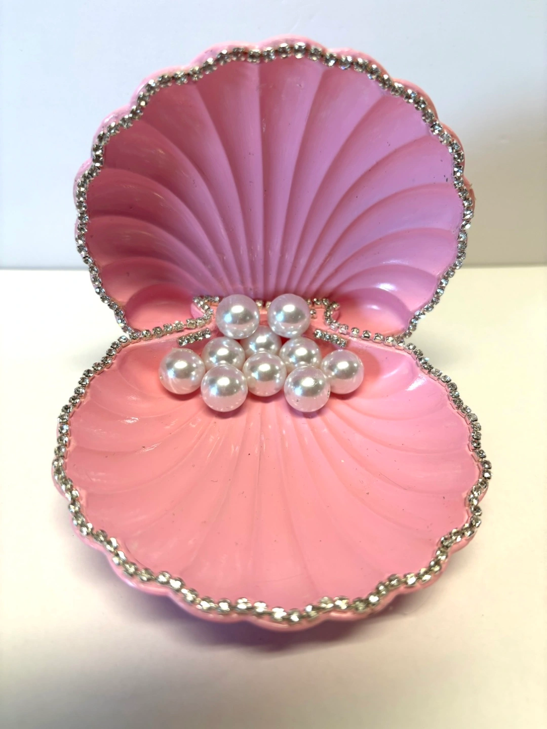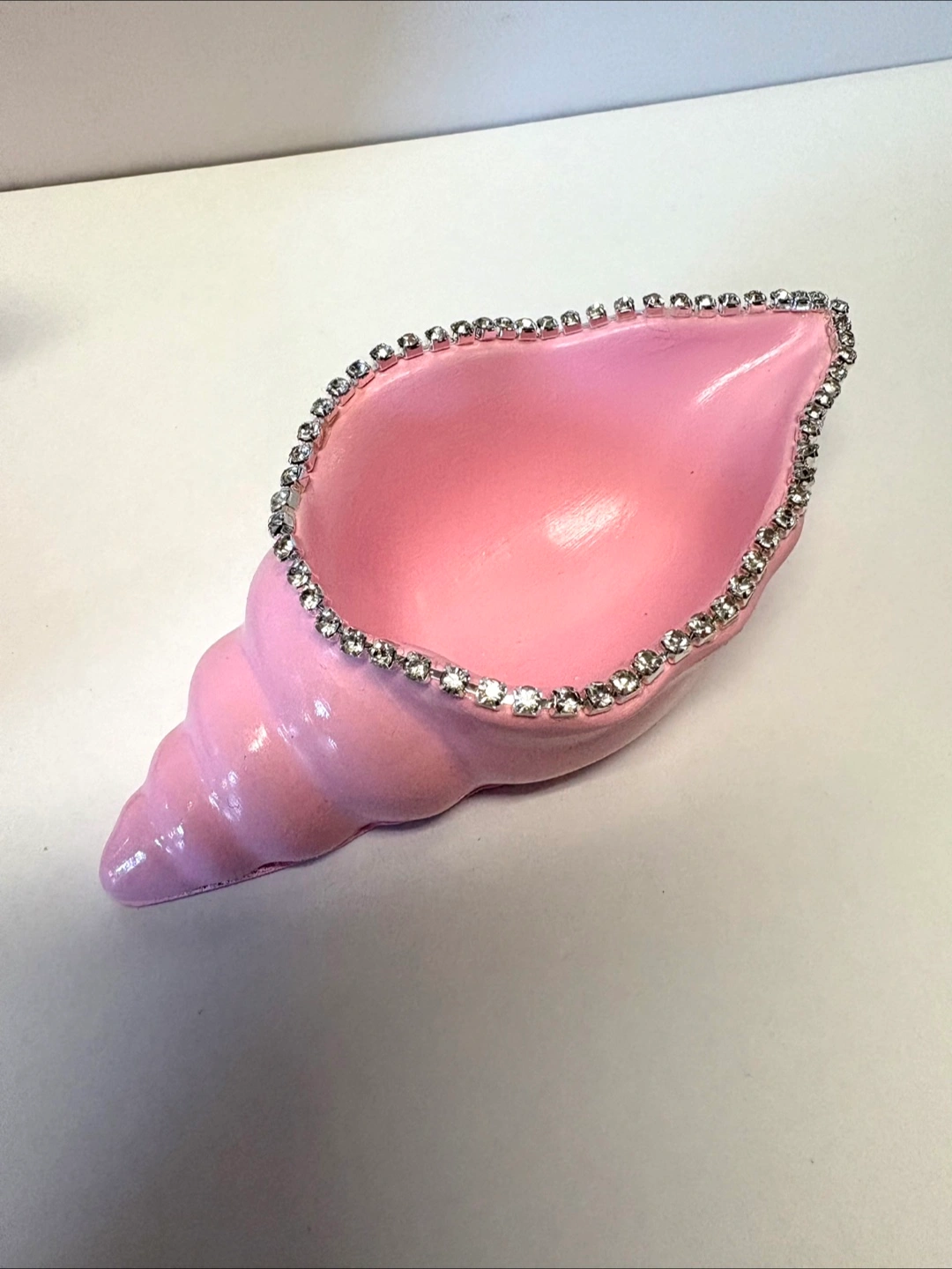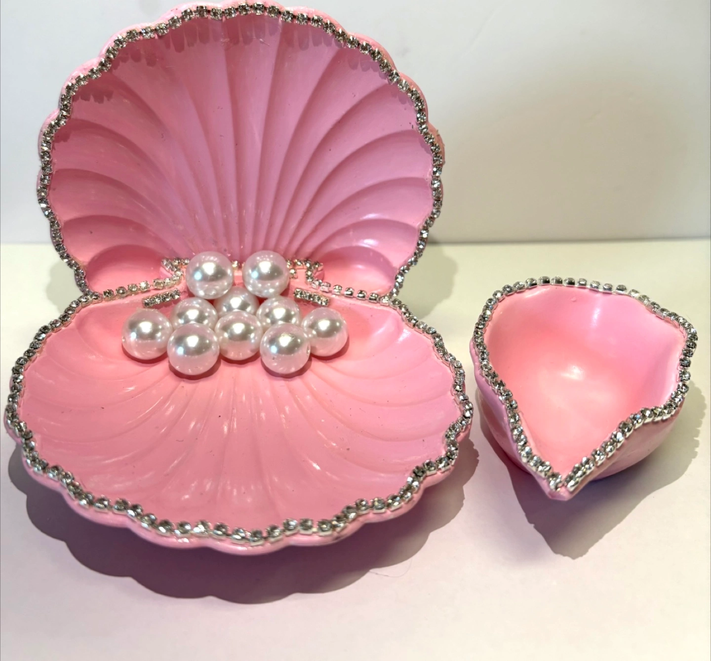 Bring a touch of the ocean to your home with this beautiful, handmade seashell dish set. Crafted from high-quality Jesmonite, this decorative piece captures the enchanting spirit of the sea. The set includes two unique shells: a stunning scallop shell that opens to reveal a cluster of faux pearls, and a graceful spiral conch shell. Both pieces feature a delicate, hand-painted light pink finish and are adorned with a border of sparkling rhinestones and silver leafing, adding a touch of elegant bling. This versatile set can serve as a functional trinket dish for rings, earrings, or small treasures, a catch-all tray on your entryway table. It’s also a perfect decorative accent for a bedroom vanity, living room shelf, or any space that needs a little coastal charm. This Jesmonite seashell set is a perfect gift for mermaid lovers, coastal enthusiasts, or anyone who appreciates unique, handmade home decor. Due to the handmade nature of these items, each one is truly unique and may have slight variations in color and texture, which adds to its one-of-a-kind charm.