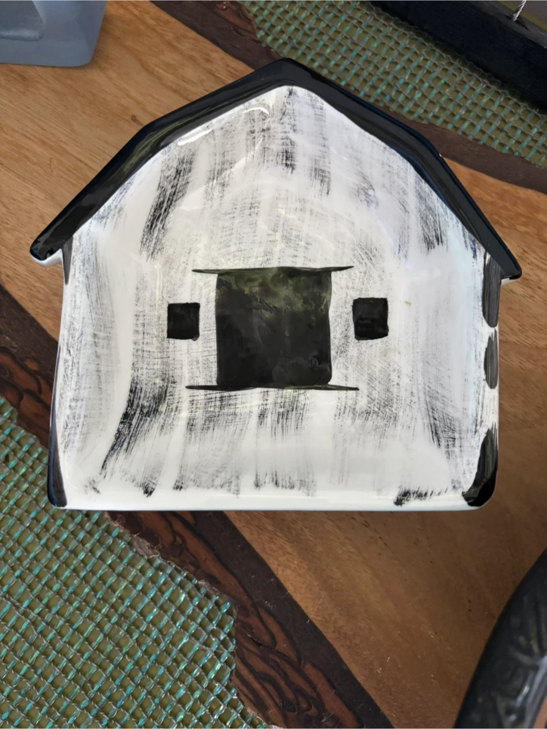 This is a cute decorative ceramic barn house! It's white with black accents and would look great on a shelf or table. It's in good condition and ready for a new home