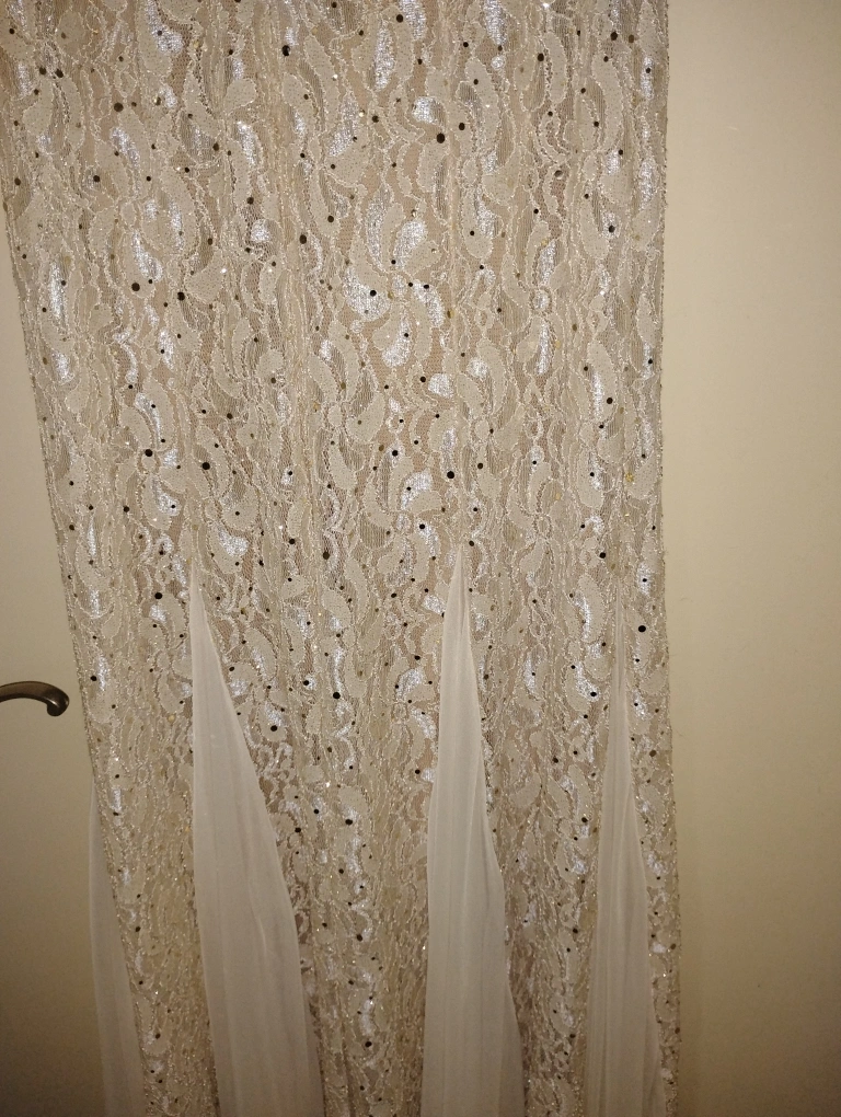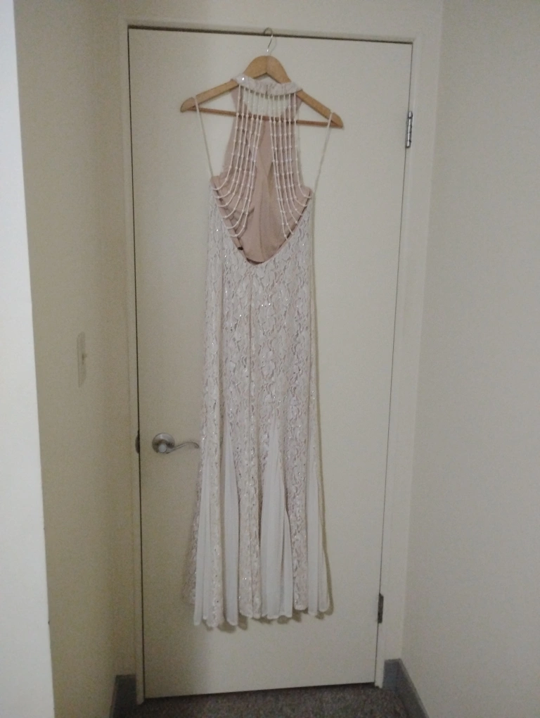 Selling a beautiful lace formal gown. It's a cream colour with a halter neckline and a beaded back. The dress has a flowing skirt with delicate detailing, perfect for a special occasion! Awesome pro detailing on the back, lightly padded bust no bra required. Size medium no try one pick up only cash only