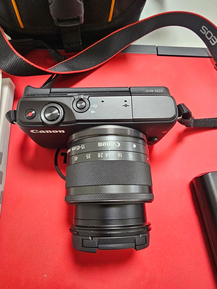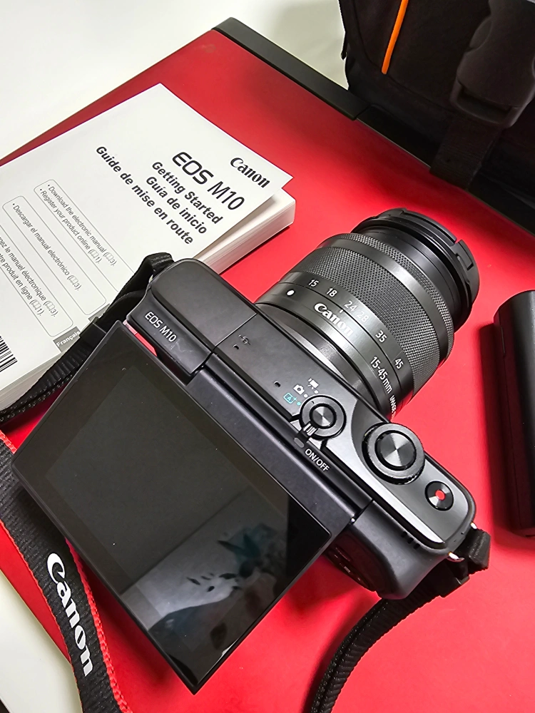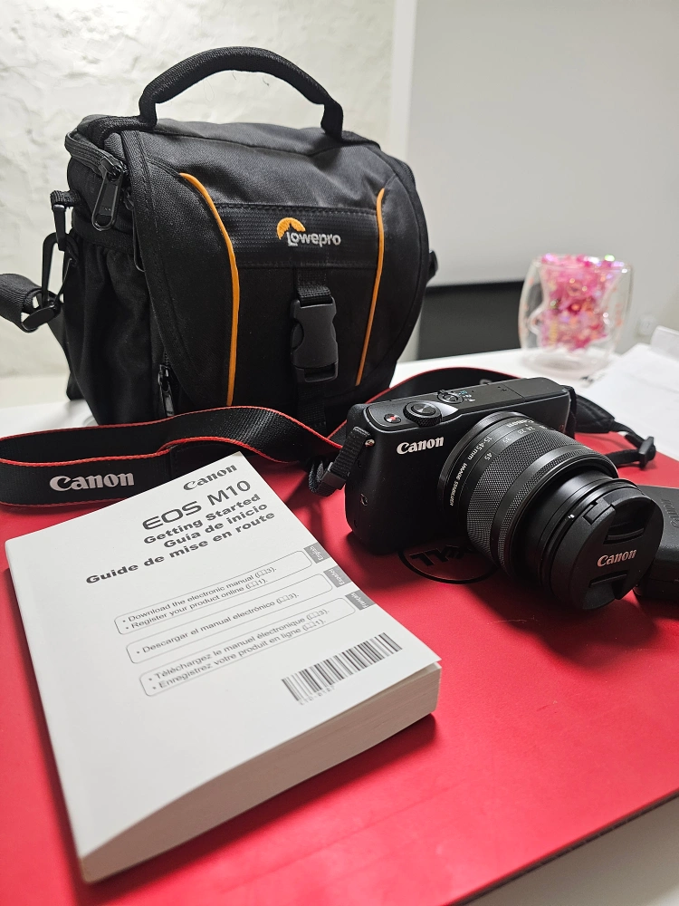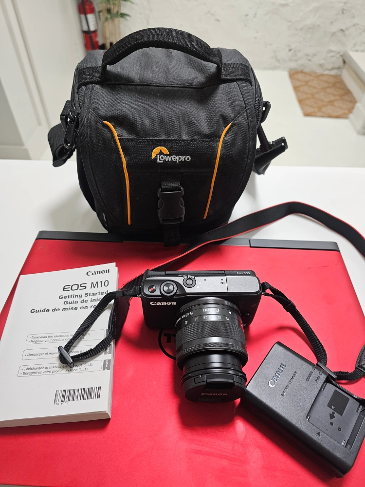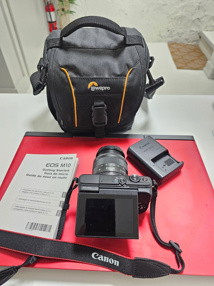 Selling a Canon EOS M10 camera, perfect for photography enthusiasts! It comes with a 15-45mm lens. Also included is a Lowepro camera bag for easy and safe transport. You'll also get the battery charger and the original guide to get you started!