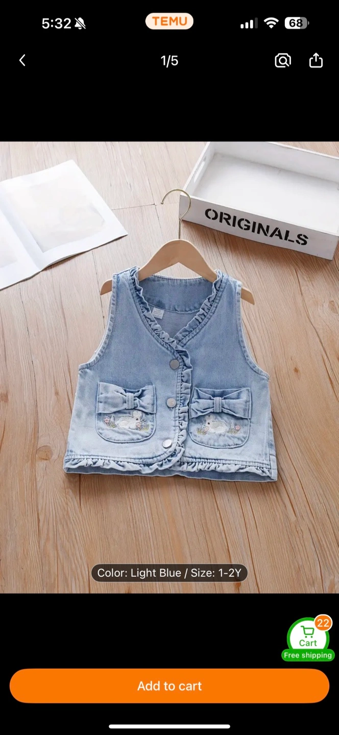 This adorable denim vest cardigan features cute rabbits embroidered on the pockets. It has buttons and is perfect for a little one aged 1-2 years. The color is a lovely light blue!
