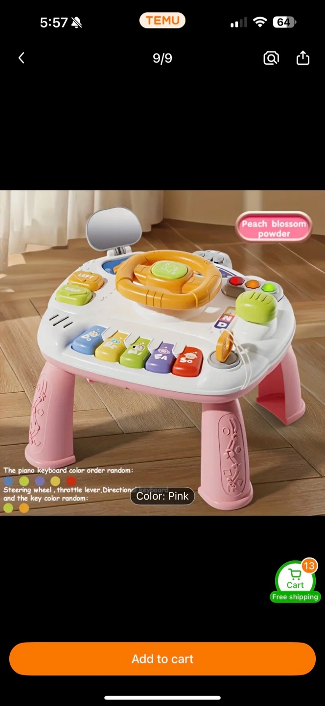 This musical learning table is perfect for little ones aged 6 months and up! It features a steering wheel, throttle lever, directional keyboard, and piano keyboard with random colours. The table is pink and provides hours of fun and interactive play for your little one