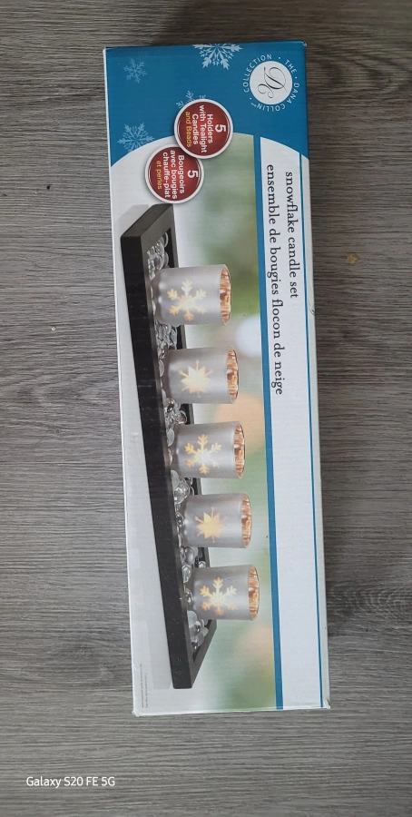 Selling a Dana Collin snowflake candle set! It comes with 5 holders, tealight candles, and beads. Perfect for adding a touch of winter charm to your home