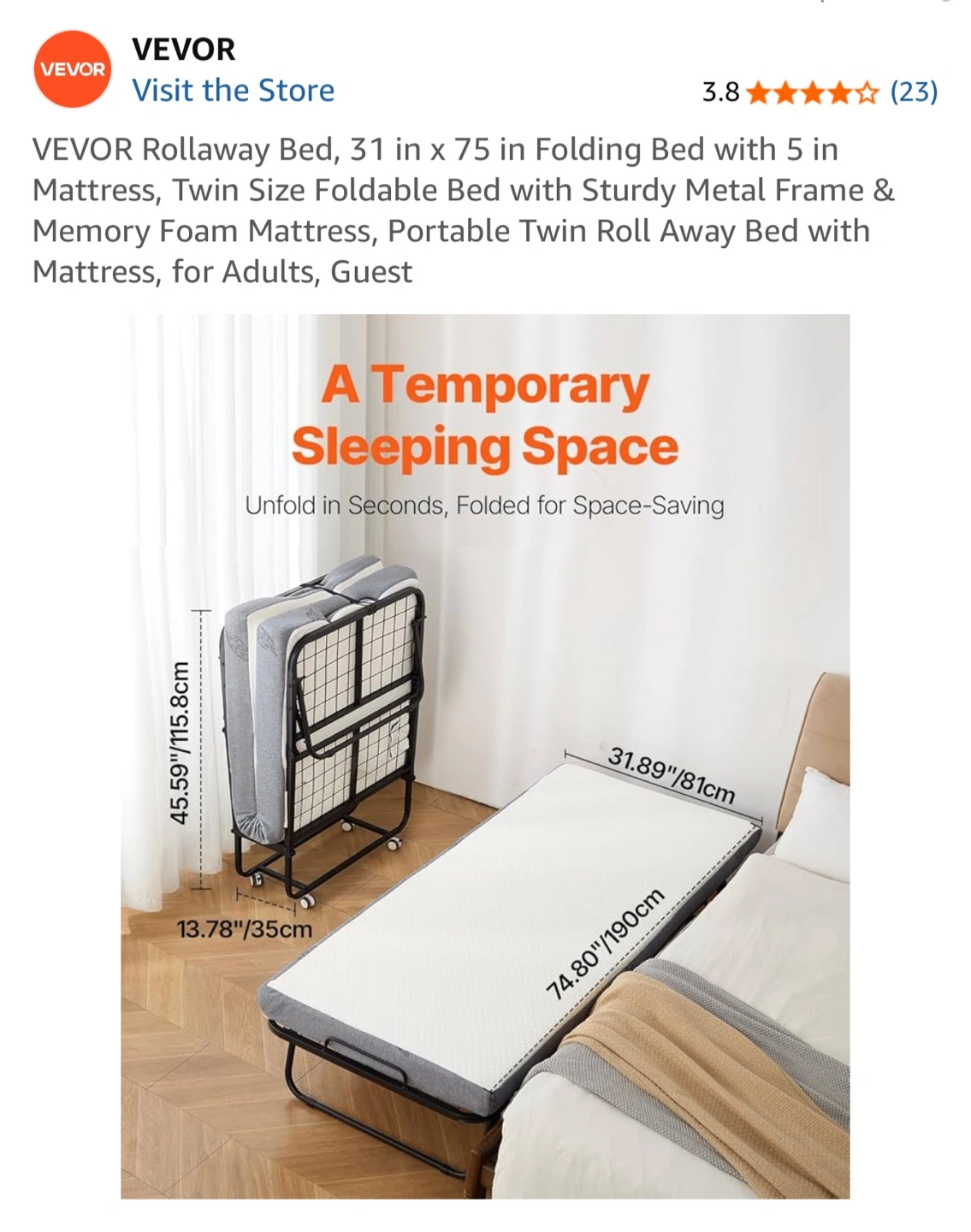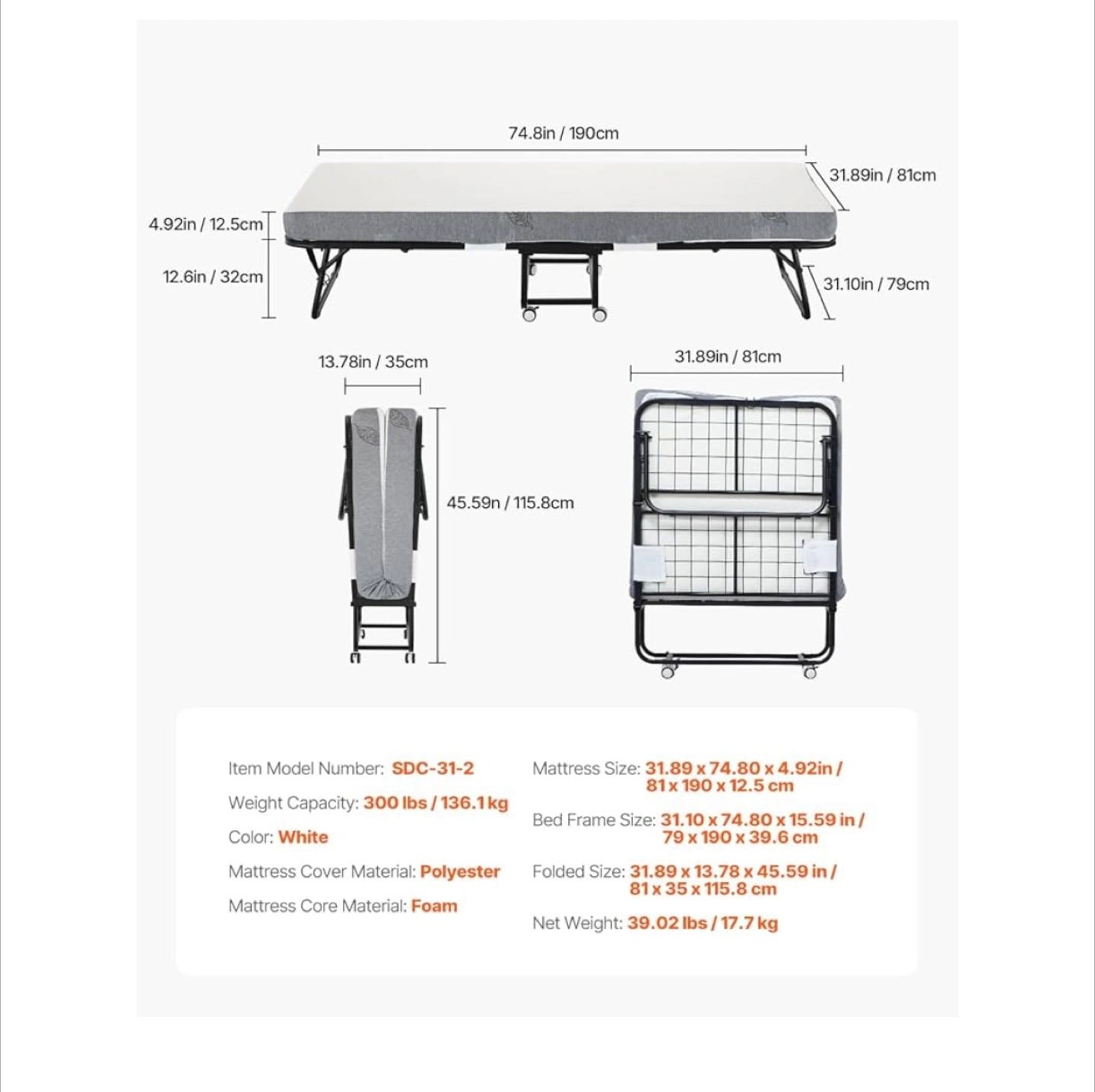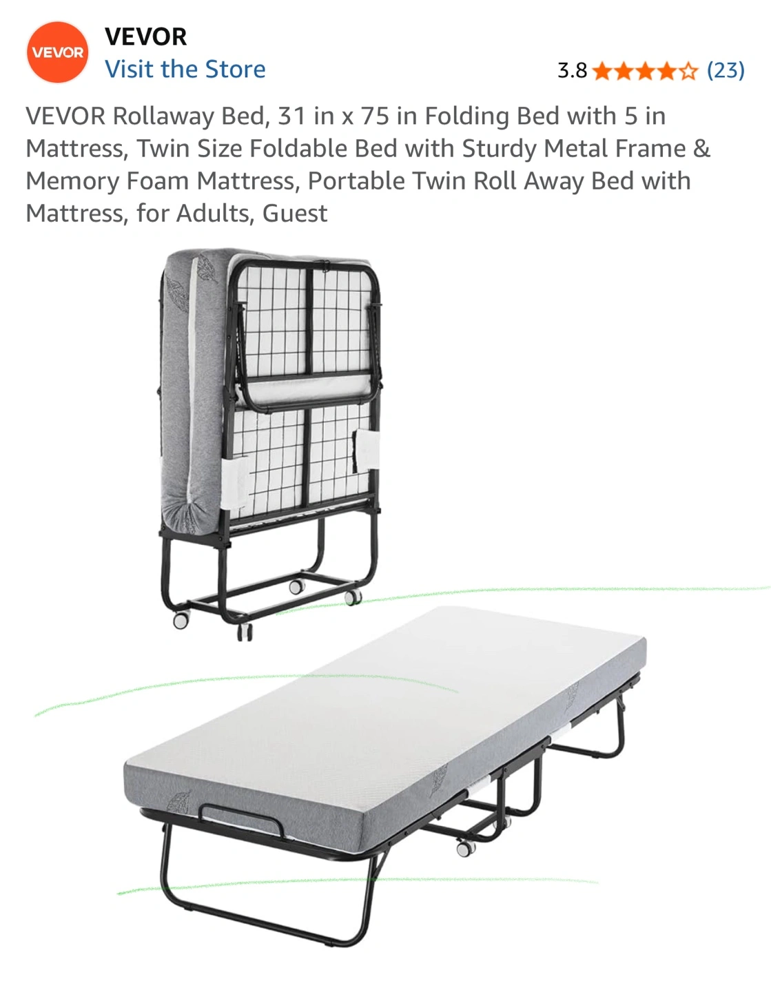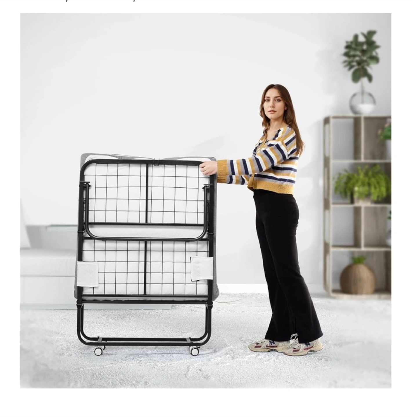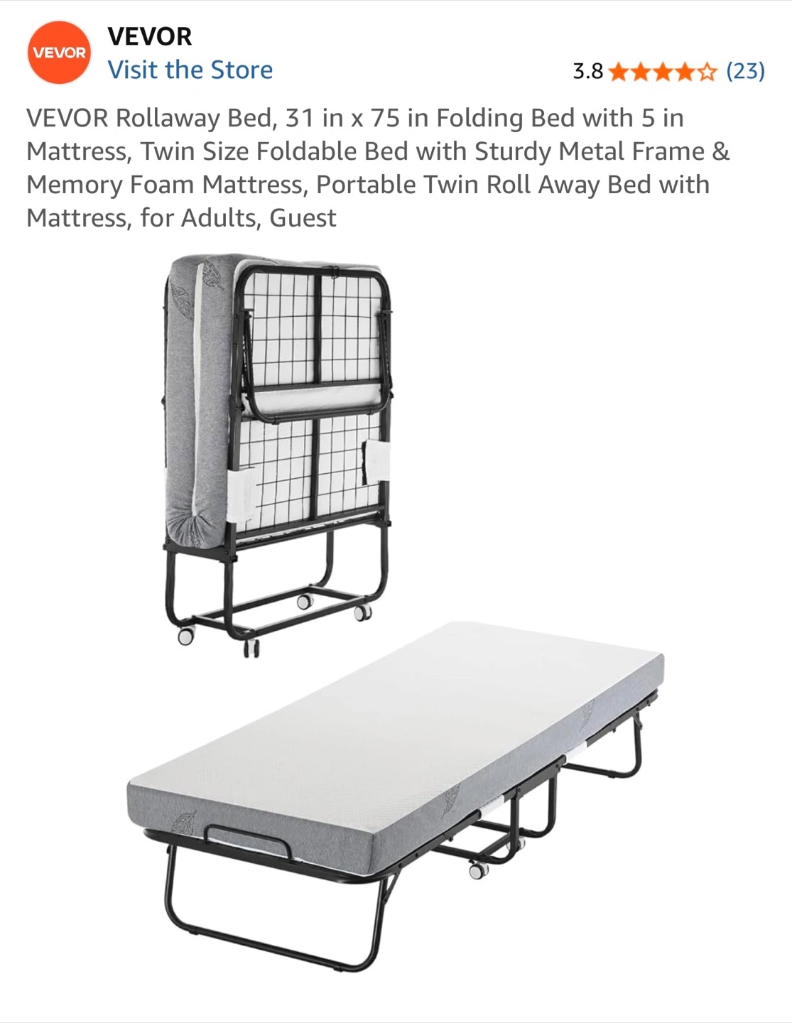 This VEVOR rollaway bed is perfect for guests or temporary sleeping arrangements - Twin size - Folds for easy storage - Sturdy metal frame - Memory foam mattress - Portable with wheels No mattress…..bed is new