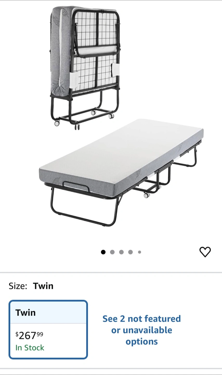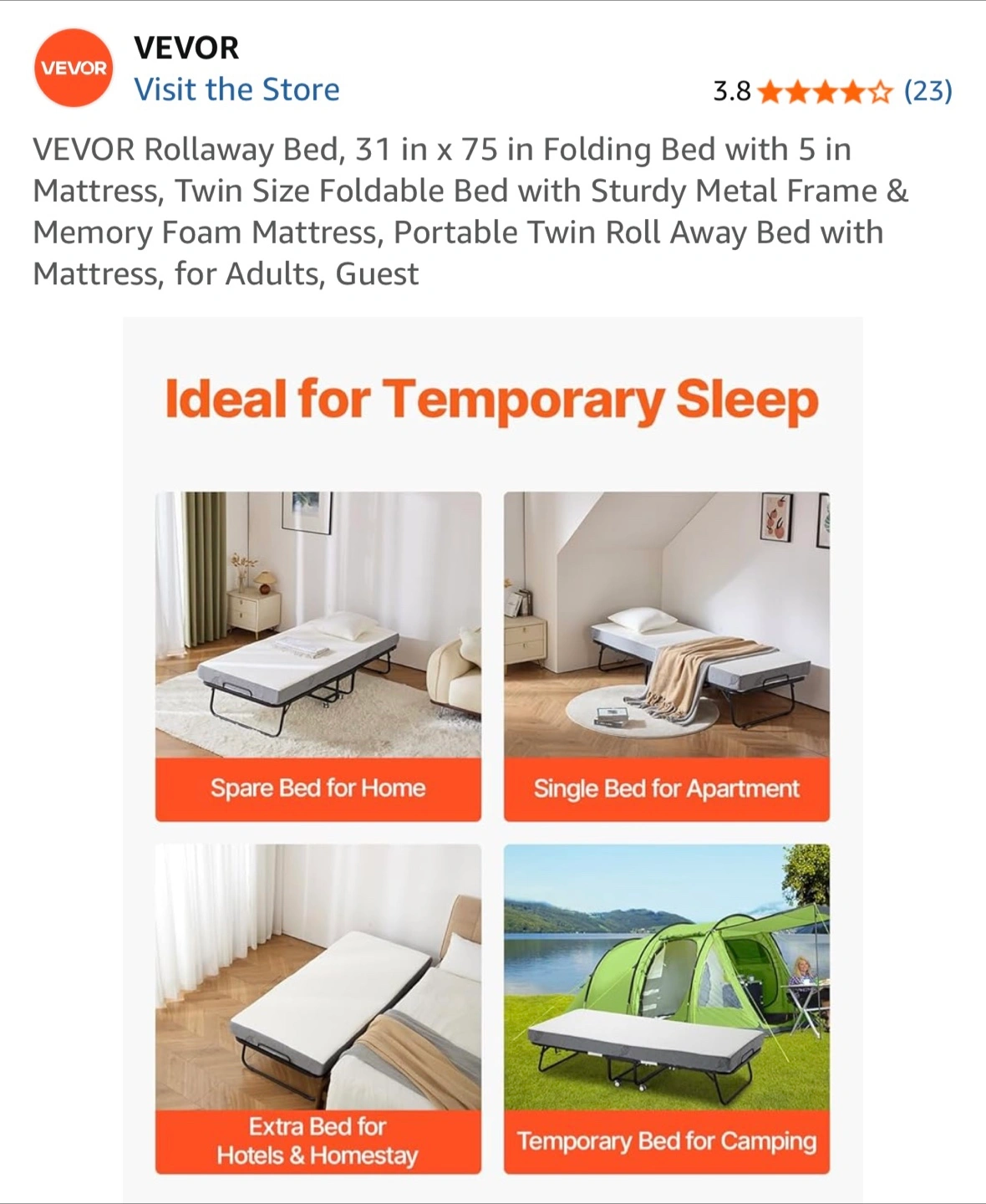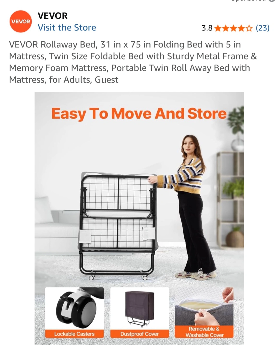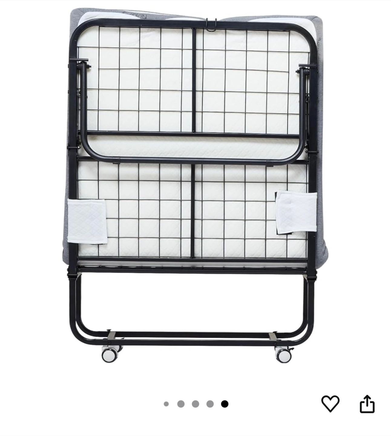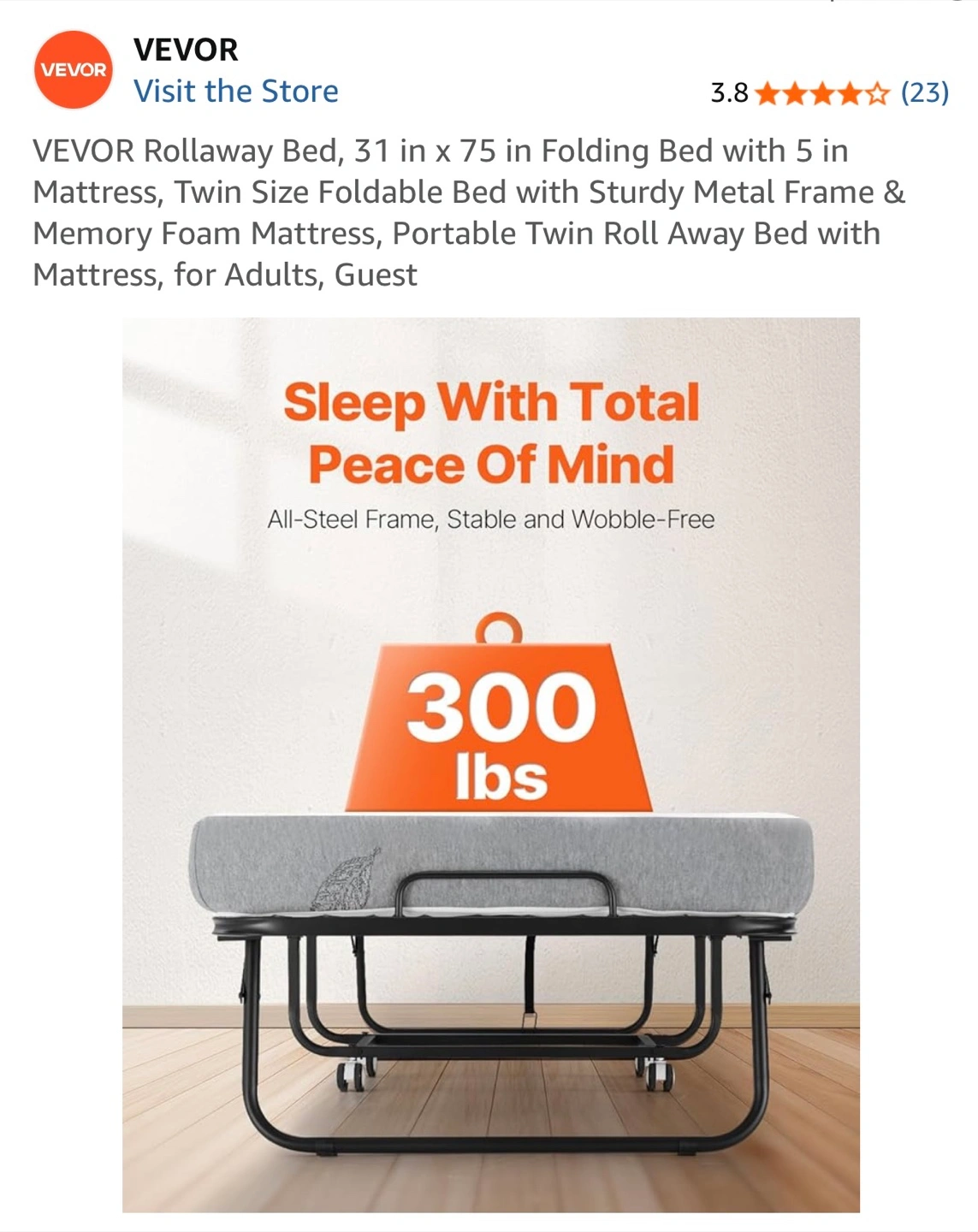 This VEVOR rollaway bed is perfect for guests or temporary sleeping arrangements - Twin size - Folds for easy storage - Sturdy metal frame - Memory foam mattress - Portable with wheels No mattress…..bed is new