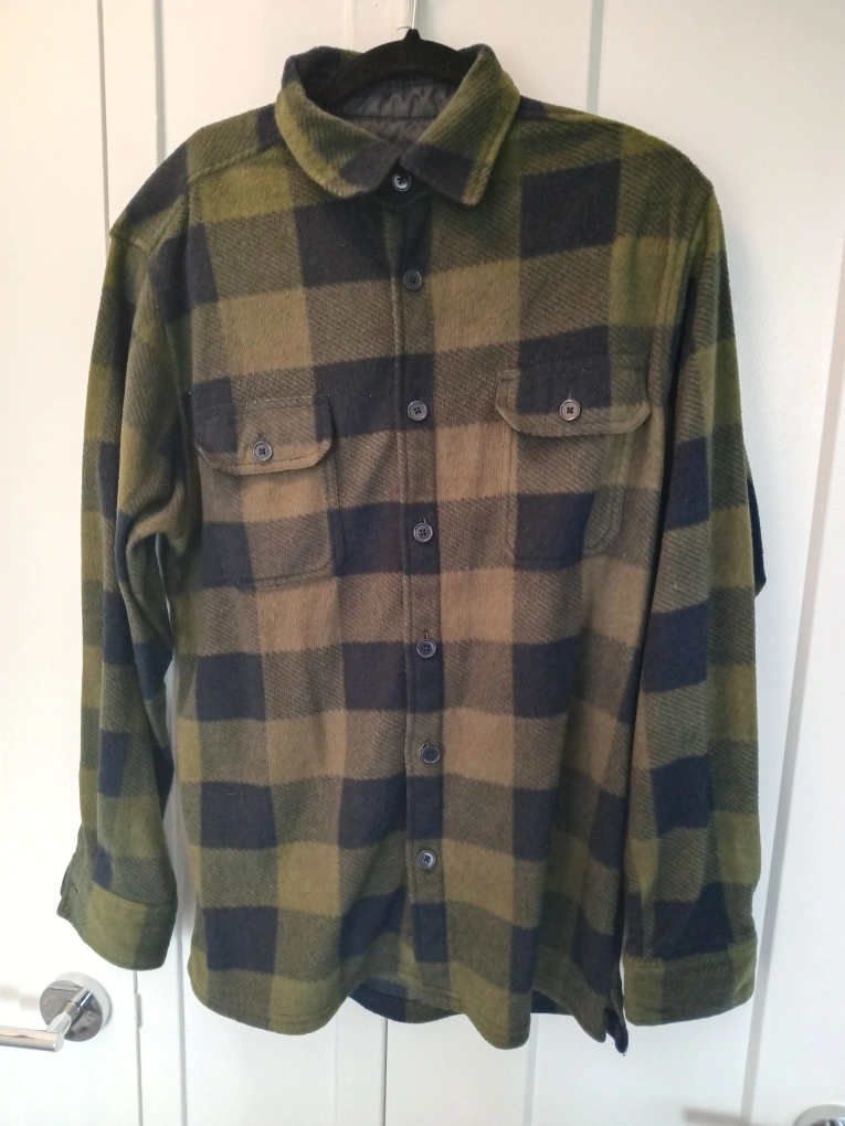 Up for grabs is a cozy plaid flannel shirt in a mix of green and black! It's perfect for layering during the cooler months or just adding a touch of classic style to your outfit. The material is soft and comfortable, making it great for everyday wear