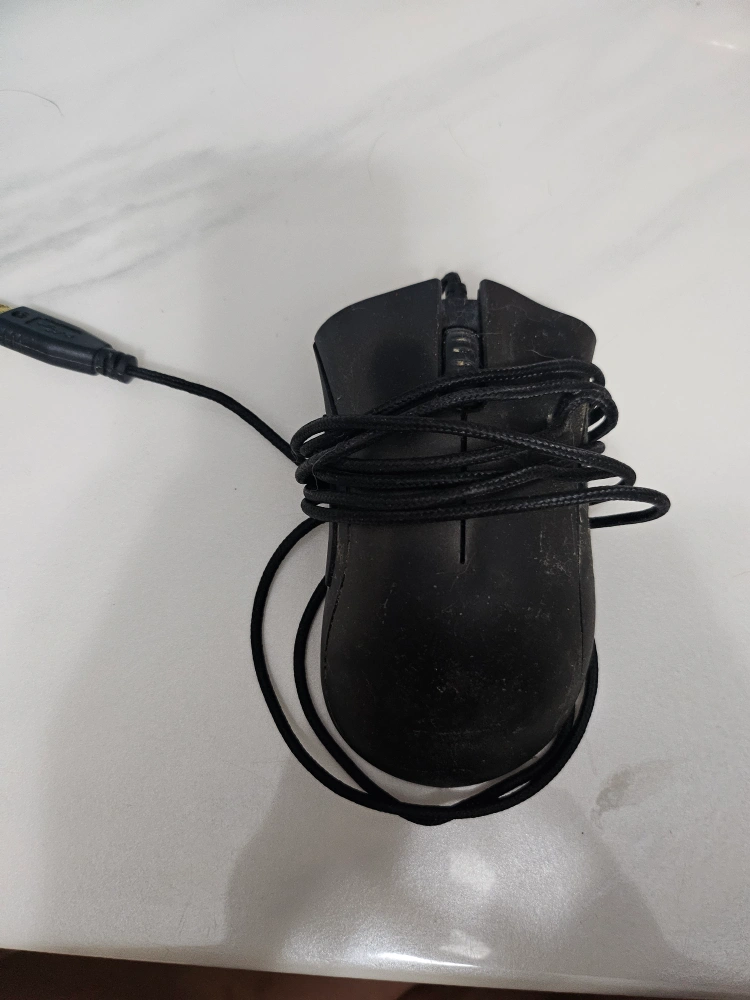 Selling a used black computer mouse. It has a wired connection. Please see the photos for the condition.