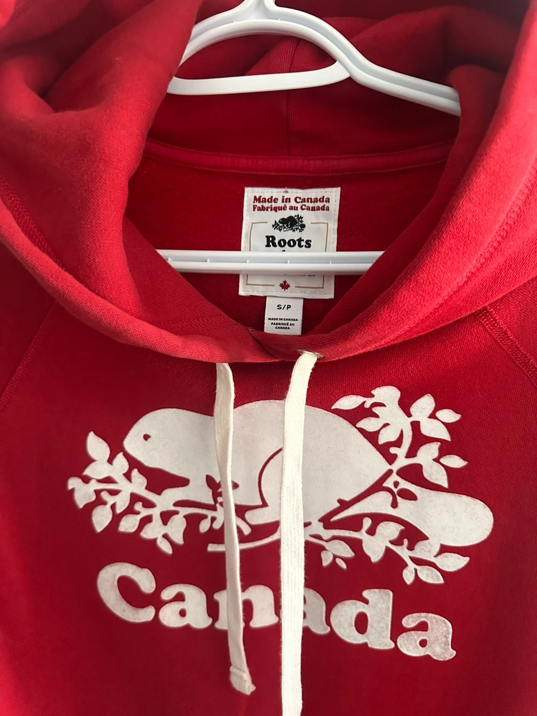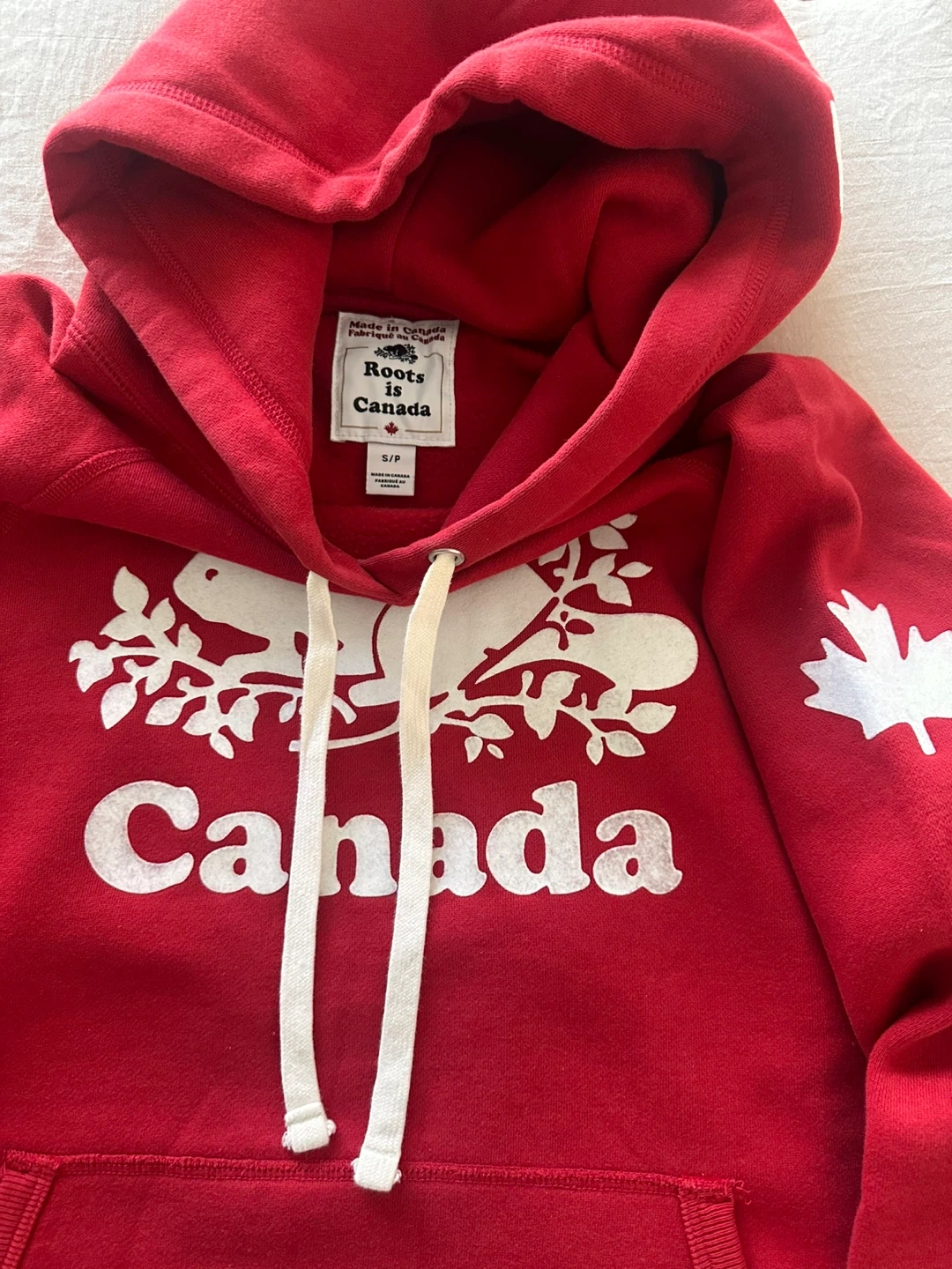 50….Selling a Roots Canada hoodie in a vibrant red colour. It's a size small (S/P) and features the classic beaver logo and a Canadian maple leaf on the sleeve. Made in Canada, this hoodie is super comfy and perfect for cozy days