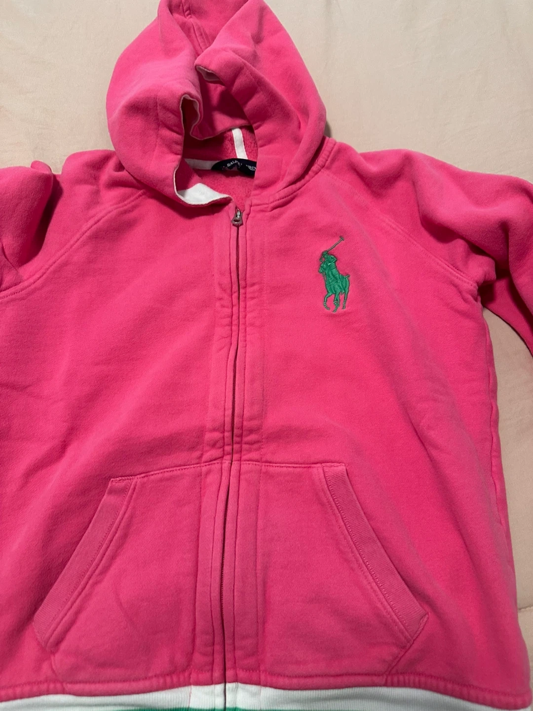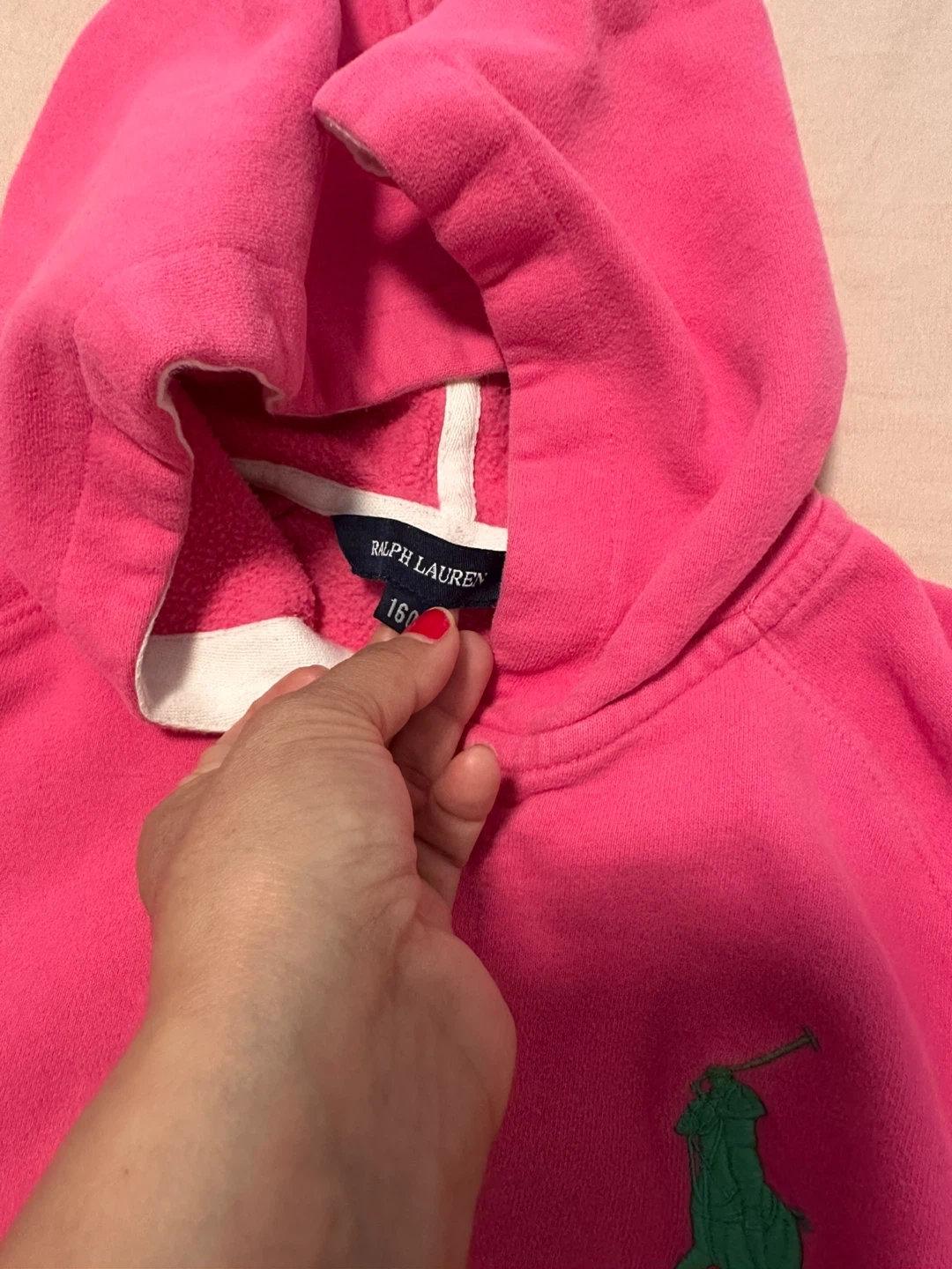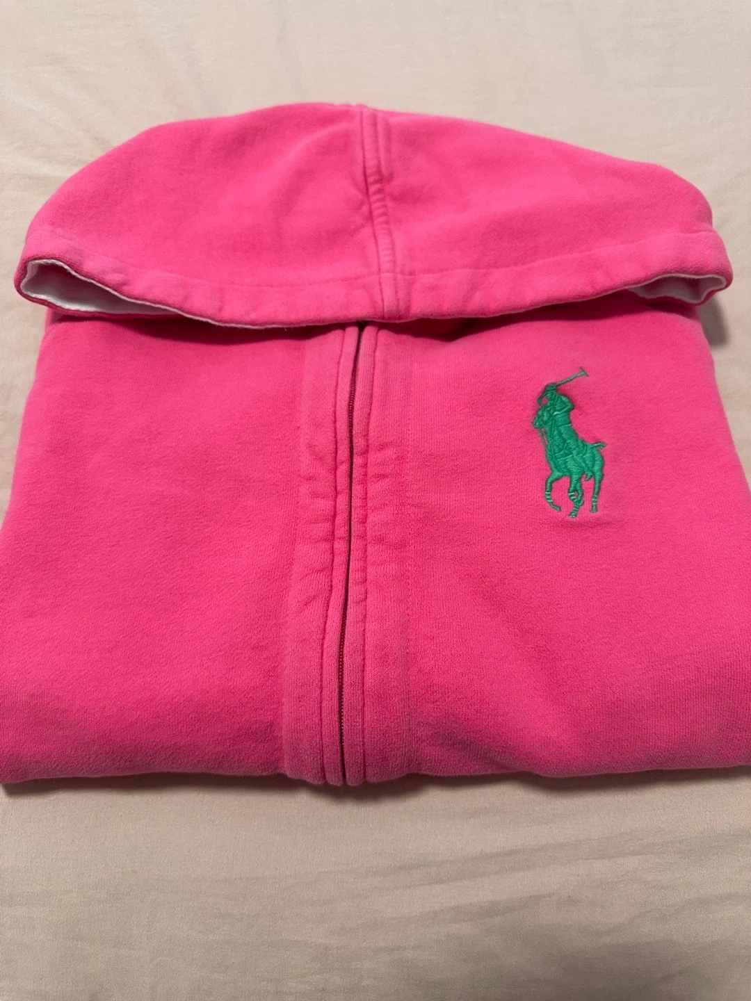 Selling a cute pink Ralph Lauren hoodie in size 16. It has a green Ralph Lauren logo on the front and a full zipper. Perfect for layering or wearing on its own!