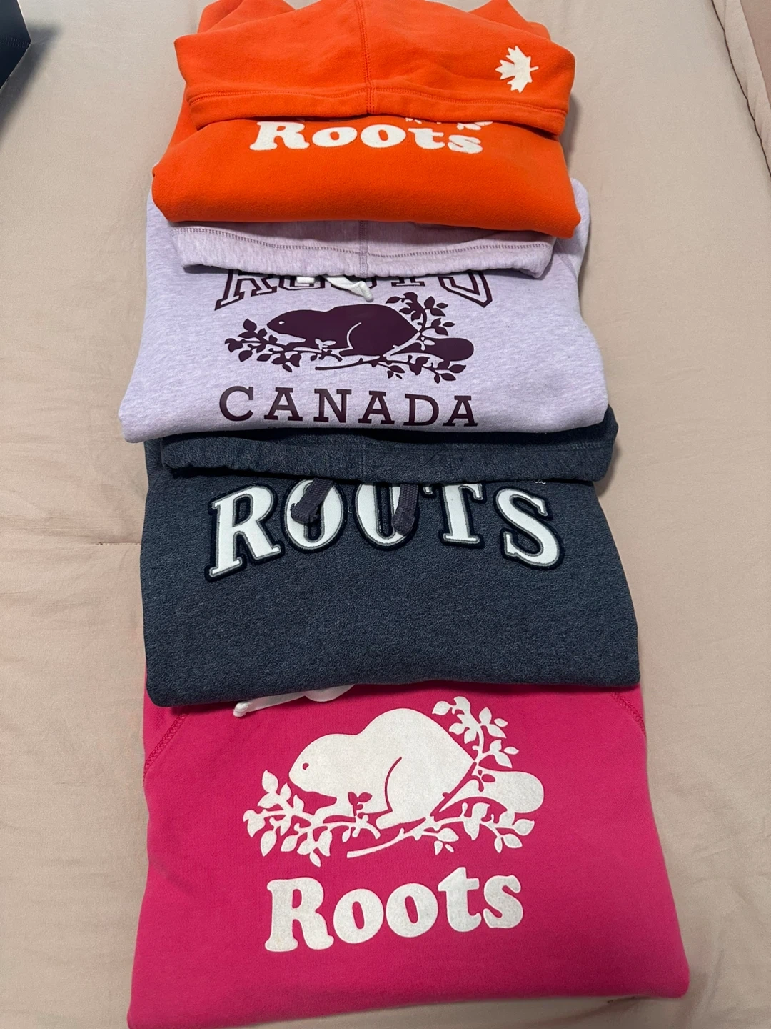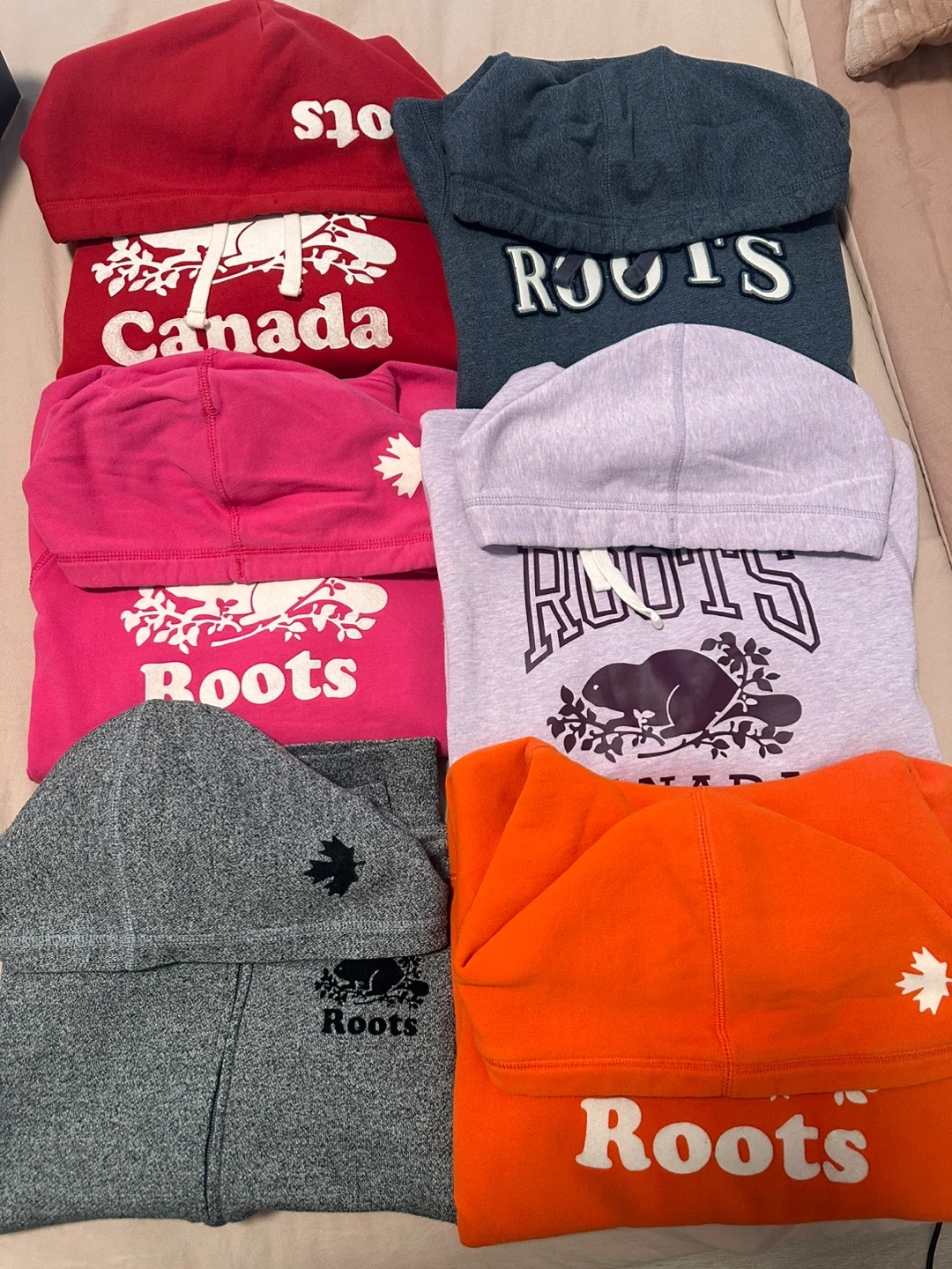 50 cad each one ****I am cleaning my closet and Selling a bundle of Roots hoodies in various colours and sizes. They're all in great condition and super comfy for those chilly Canadian days! Perfect for layering or just lounging around the house. Get a bunch at once!