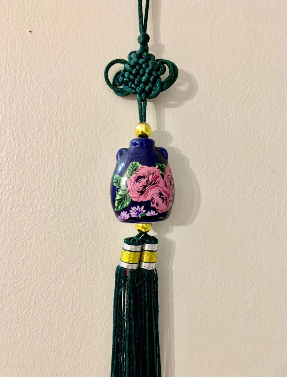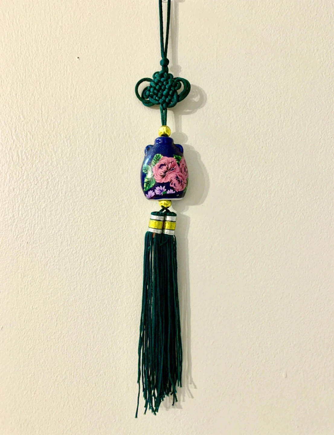 This is a lovely decorative Chinese knot tassel. It features a blue ceramic piece with a floral design and a green tassel. It would make a nice addition to any room Wpuld love to pass this onto someone who truly appreciate and love this 🥹 it was never really used at all just when I was moving the strings got lose on some. But still really pretty! ——- Weekdays only free Monday- wed after 5pm Weekends: sat- noon-2pm Sunday- 11 to 1pm ✨pick up at my condo building ONLY✨