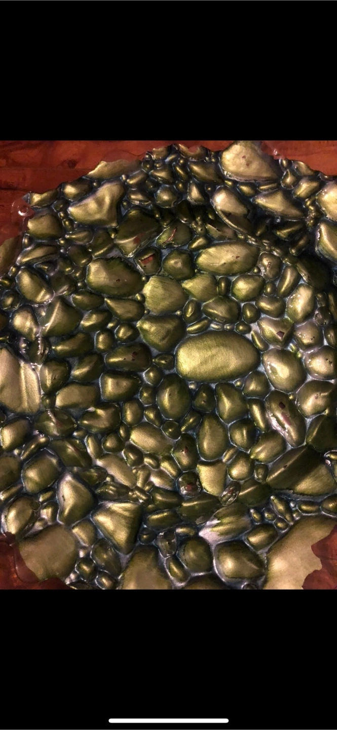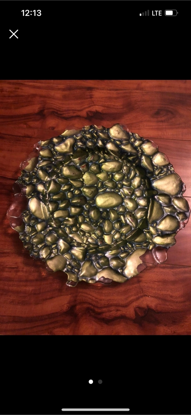 Decorative plate with a unique design. It features a textured surface resembling stones or pebbles, finished with a metallic gold colour. It would make a great decorative piece for your home