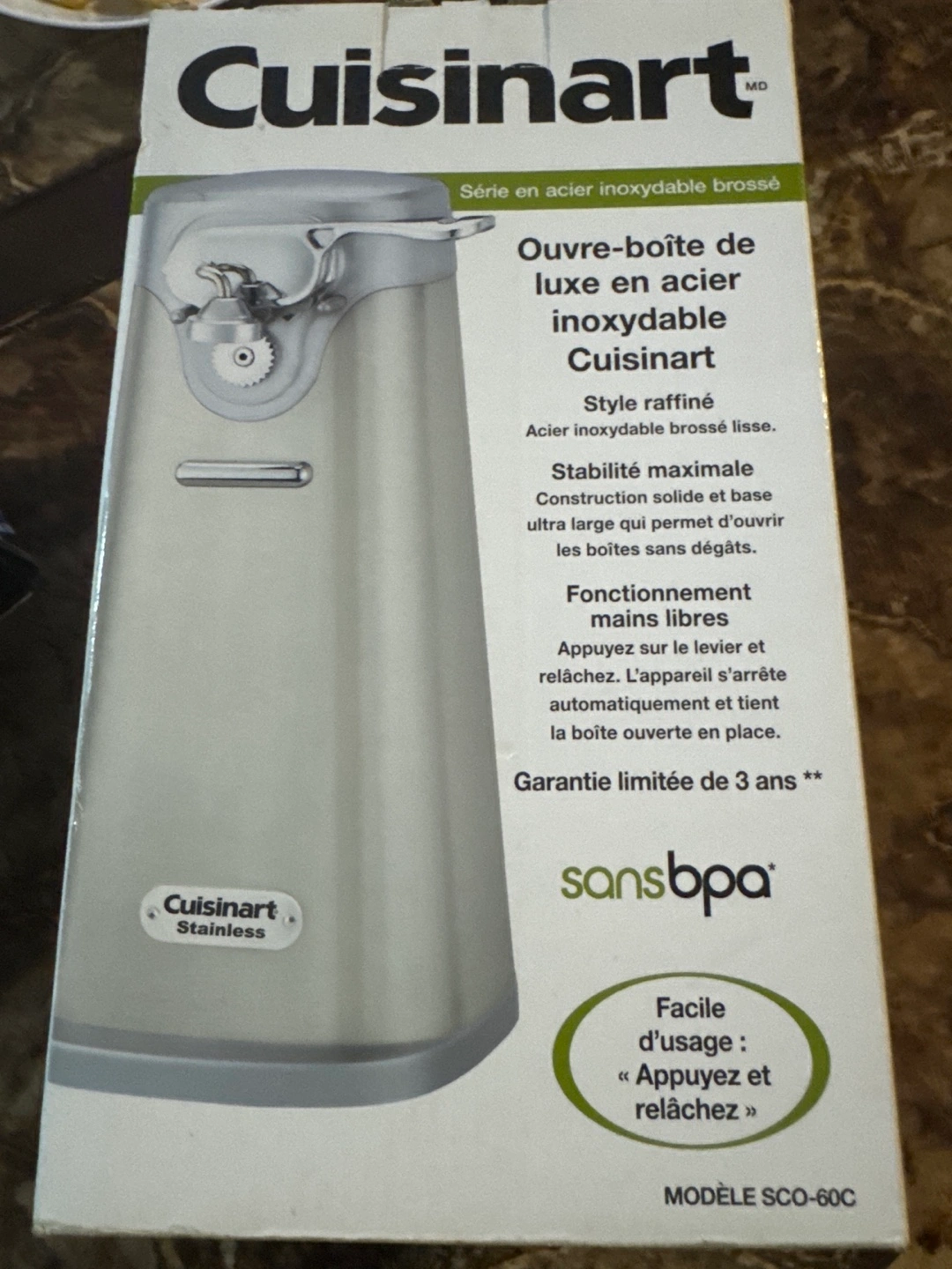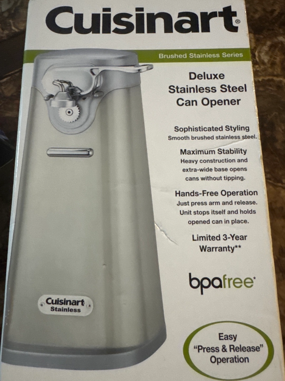 Selling a brand new Cuisinart Deluxe Stainless Steel Can Opener, model SCO-60C! It features: - Sophisticated styling with smooth brushed stainless steel - Maximum stability with heavy construction and an extra-wide base to prevent tipping - Hands-free operation: just press the arm and release; the unit stops itself and holds the opened can in place - Easy "Press & Release" operation - Includes a limited 3-year warranty It also has a BPA-free design. Box included!