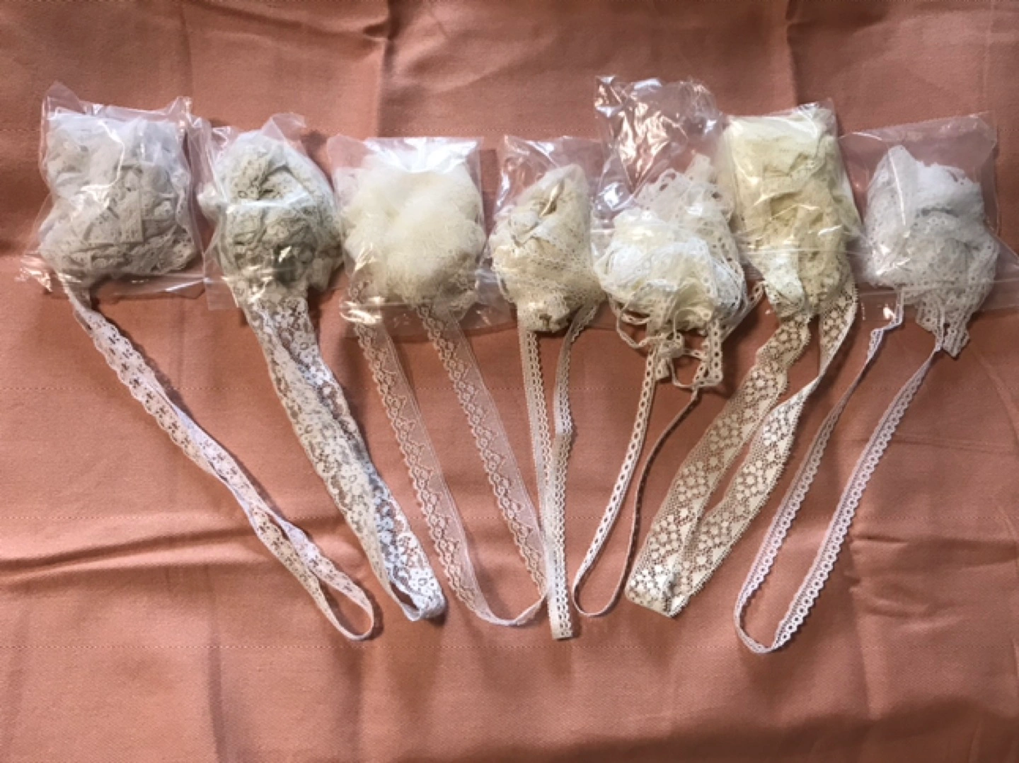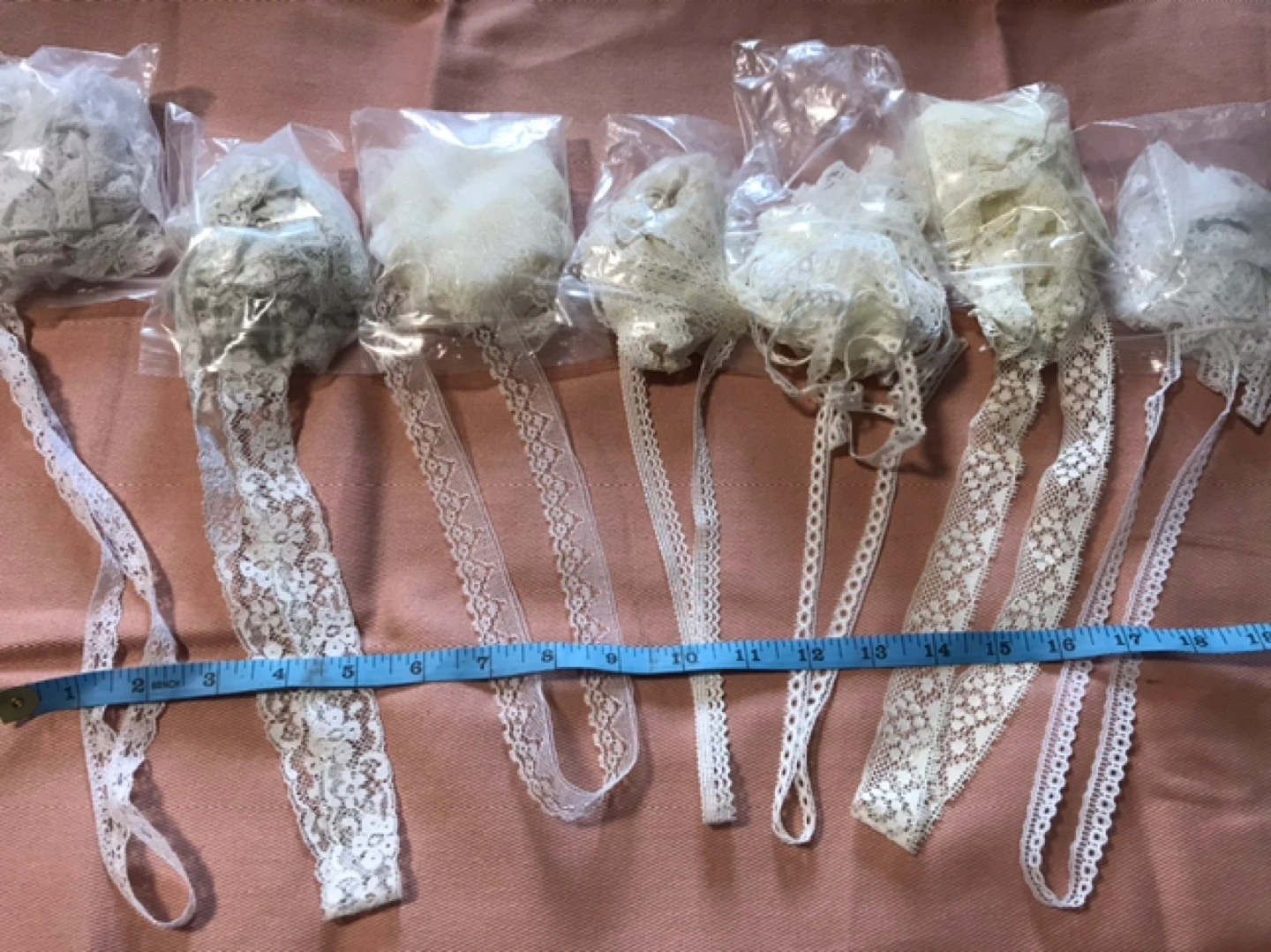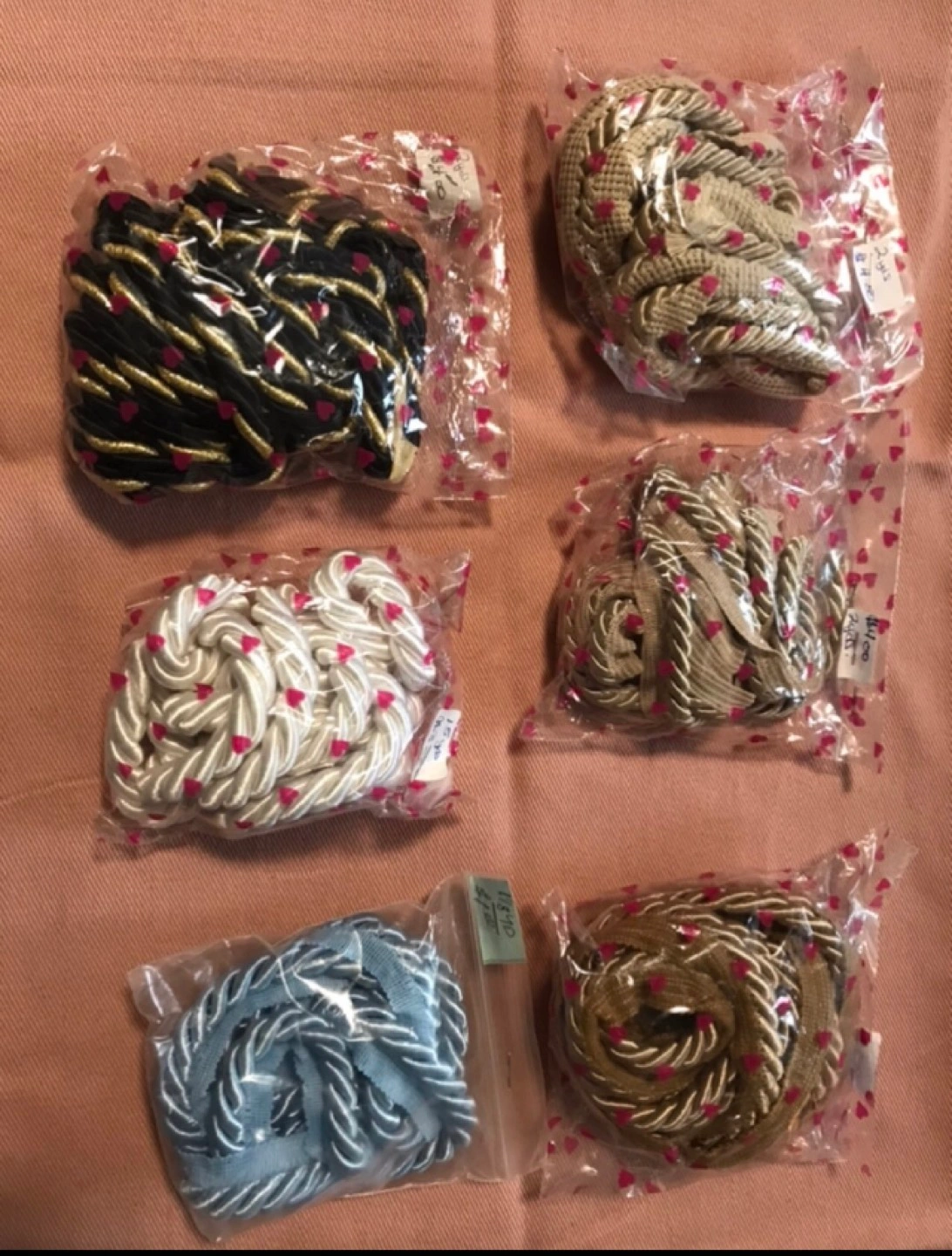 Pics1&2) Assorted Size Lace Trimming $30 For All New/Unused Width Size on pic Size from 3/8” to 1” Each pack has 10 Yards Beautiful white,cream trimmings Retail will be more expensive plus taxes Perfect for a new project Pickup near wonderland Pics3&4) Pink Binder Lace Trimming $50 For All New/Unused Width Size on pic Each pack has 5 Yards Beautiful pink lacing with white embroidered border Retail will be more expensive plus taxes Perfect for a new project Pickup near wonderland Pics5&6) Golden Brown Lace Trimming $30 For All New/Unused Width Size on pic Each pack has 5 Yards Beautiful golden brown lacing with scalloped embroidered border Retail will be more expensive plus taxes Perfect for a new project Pics7) Bullion Fringe Trimming $15 For all New/unused pieces Length the package Colours black gold white brown blue tan Perfect for new creation Pickup near wonderland