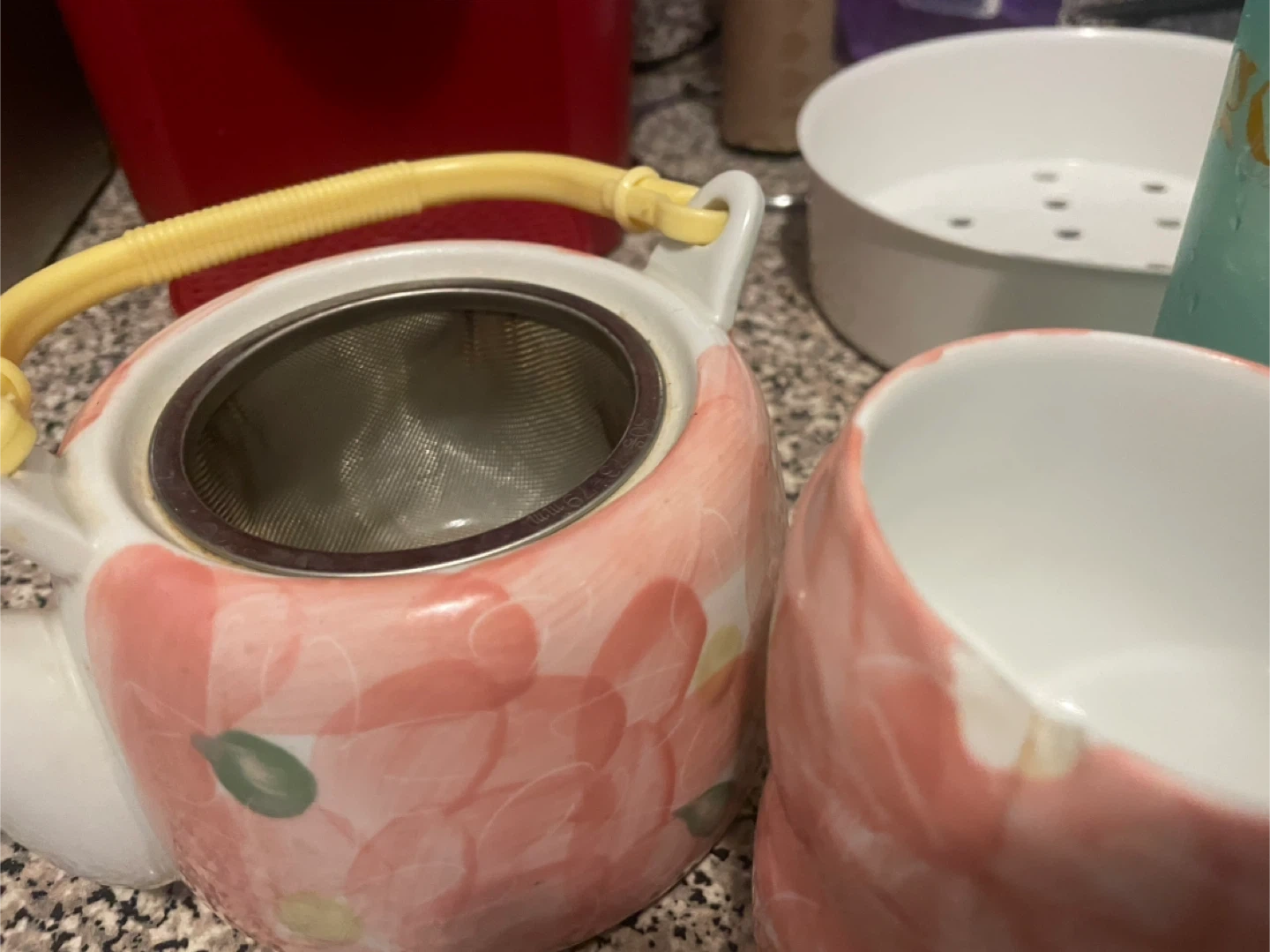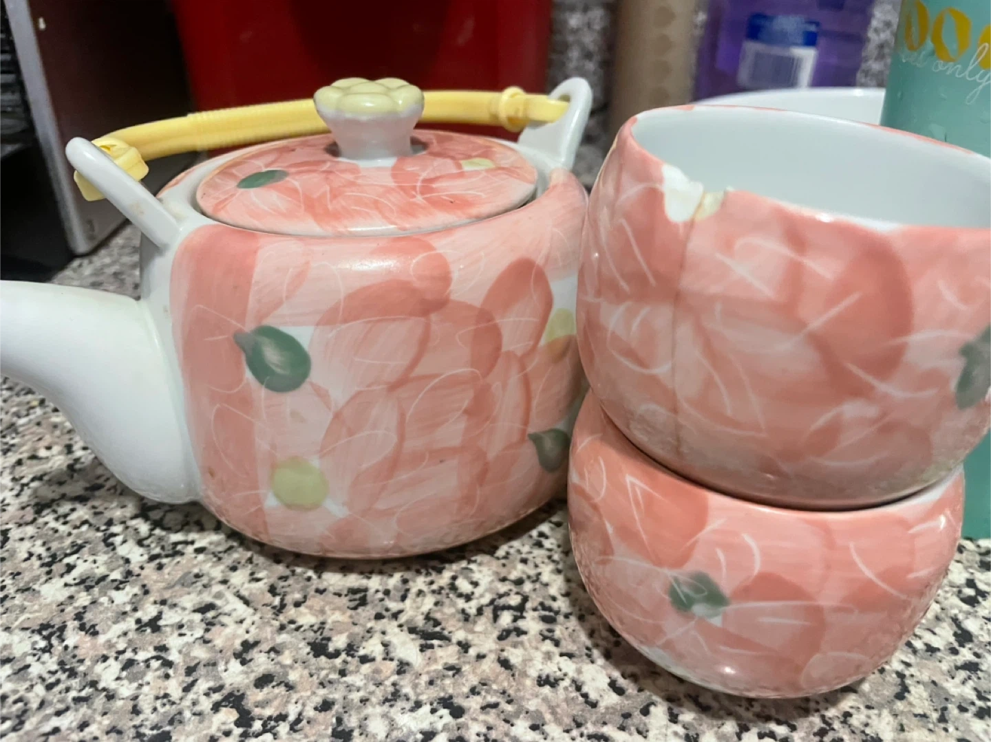 I'm selling a charming floral tea set. It includes a teapot with a lid and two matching cups. The set features a lovely floral pattern in shades of pink and white. It's perfect for tea time with friends or a cozy afternoon treat!