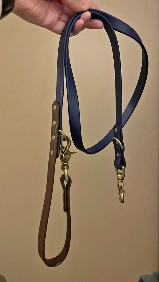Midnight blue leash with dark brown handle and brass hardware. 4ft x 5/8”