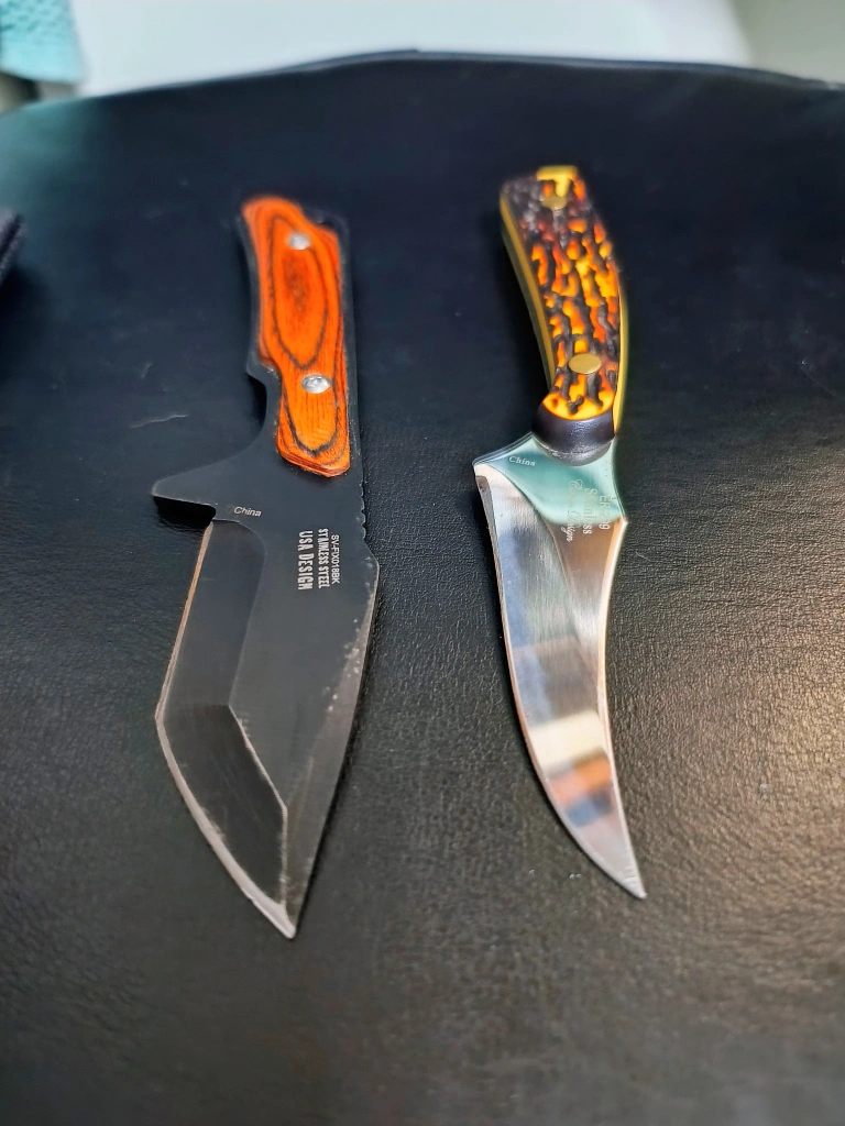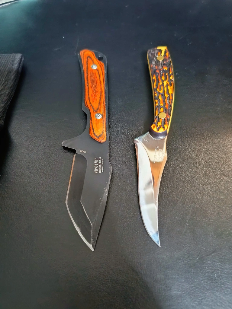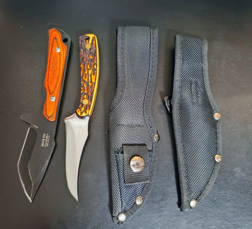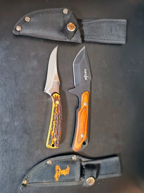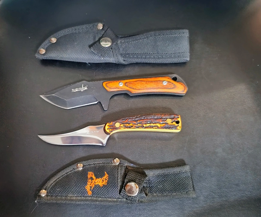 Two hunting knives, each with its own sheath. One is a 'Survivor' brand knife with a black blade and wooden handle. Both are in good condition and ready for your next outdoor adventure. **These are being sold together, at the firm cost of $20. (it's not worth my time meeting for 1 for $10) ** ** Pick Up In Kentville **