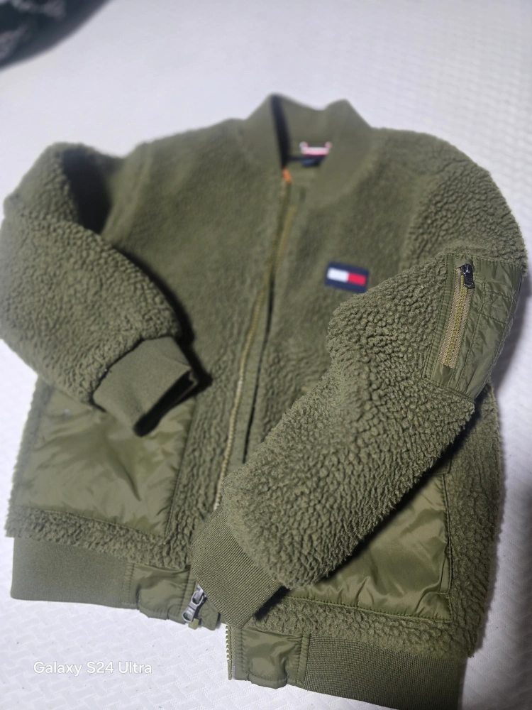 Selling a Tommy Hilfiger bomber jacket in a nice olive green colour. It's a super cozy fleece material and in great condition! The size is S (6-7).