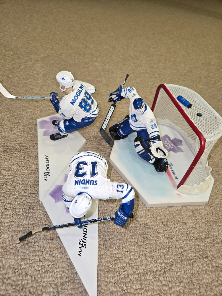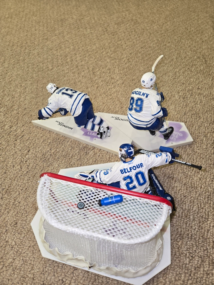 Selling a set of Toronto Maple Leafs hockey figurines. The set includes figures of Mogilny, Sundin, and Belfour, complete with a hockey net. A great collectible for any Leafs fan!