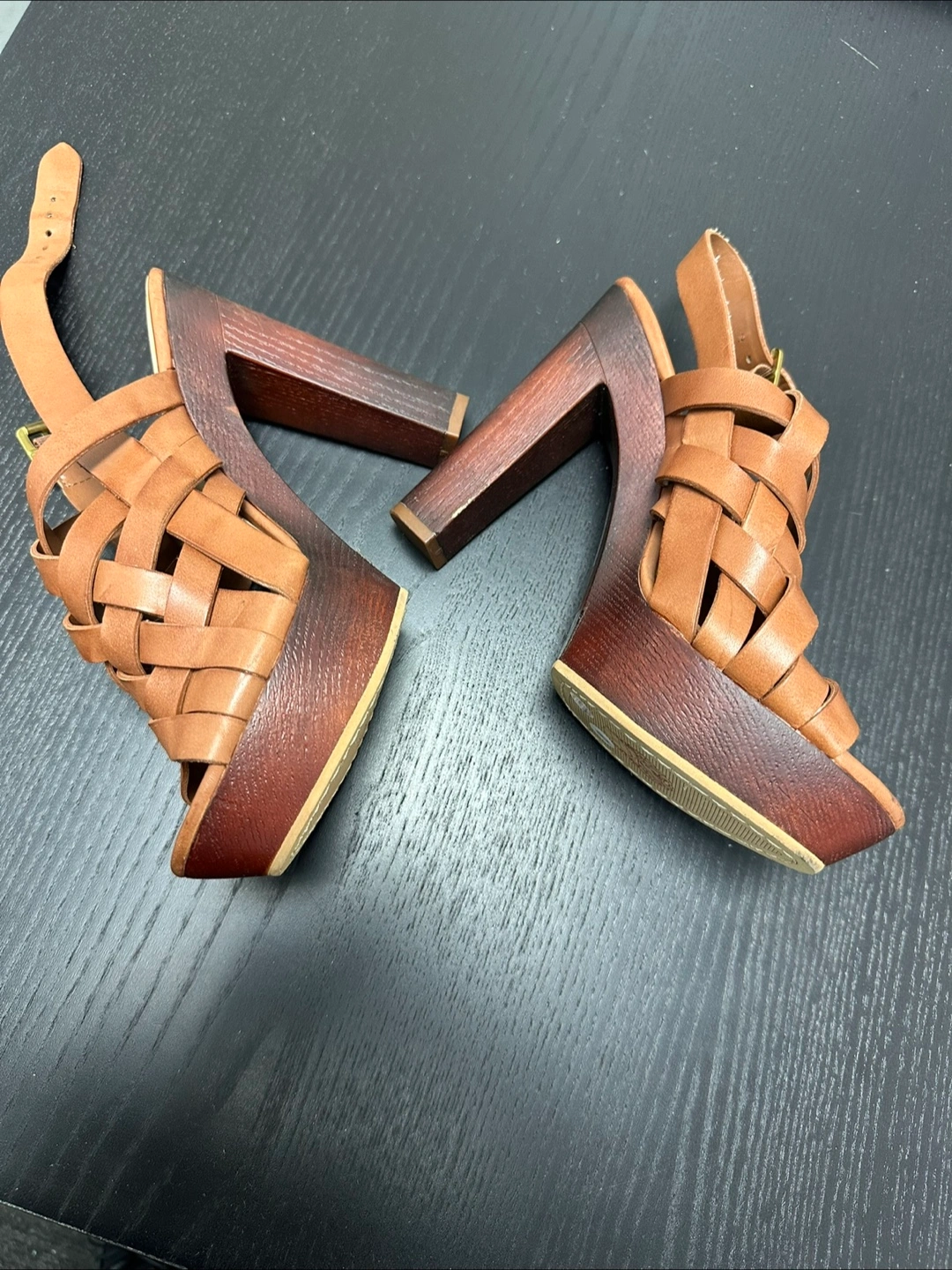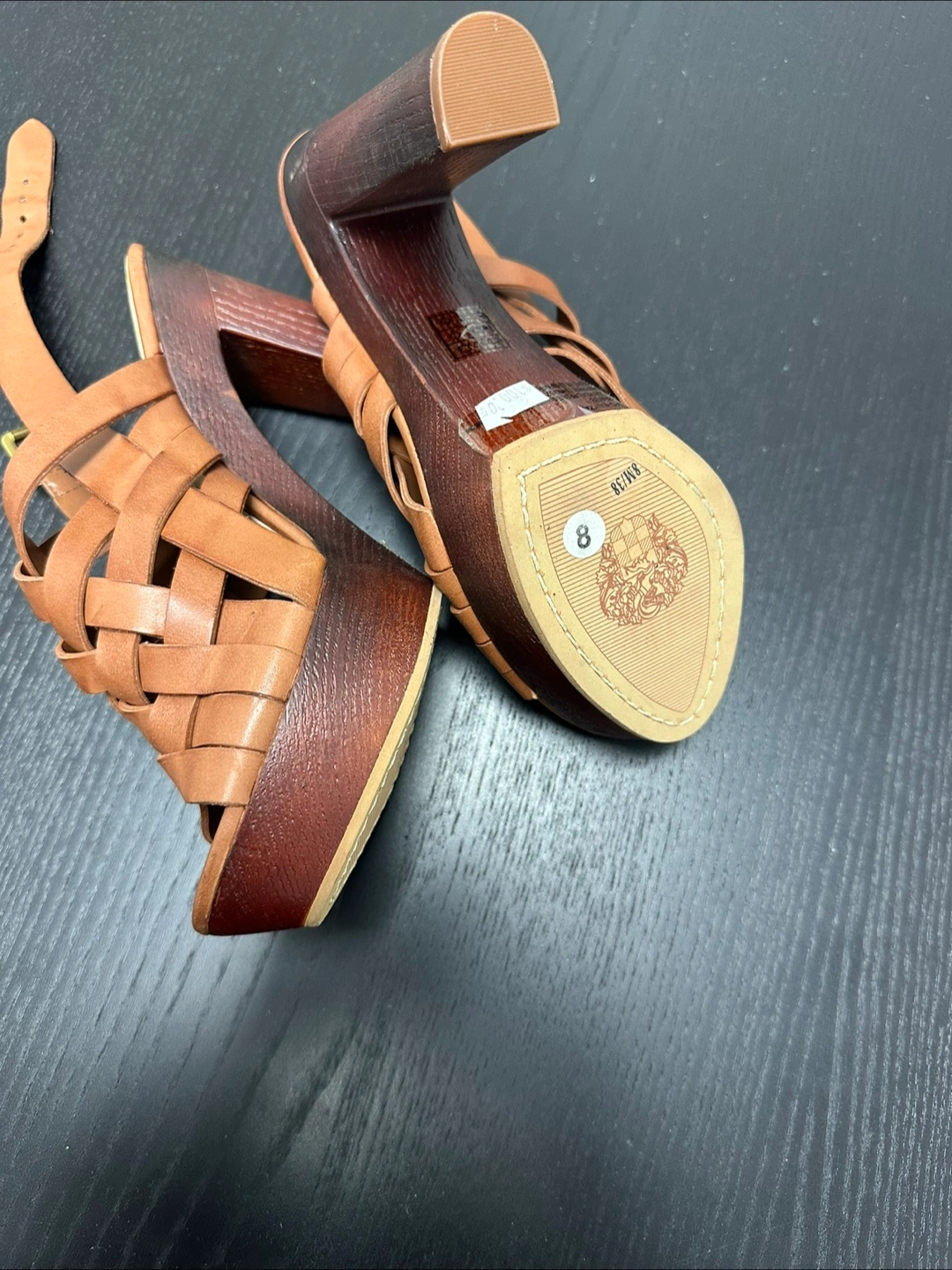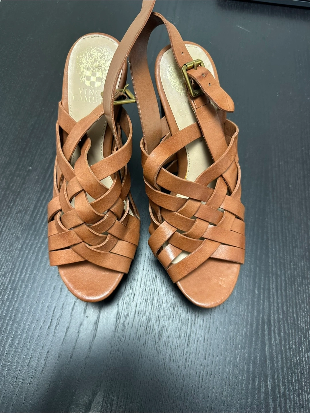 These Vince Camuto heels are a stylish addition to any wardrobe! They feature a unique woven leather design in a beautiful brown colour. The chunky heel and platform add height while remaining comfortable.