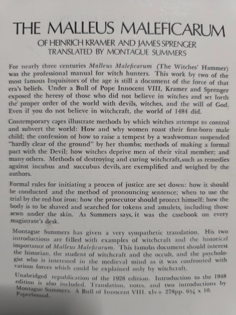 "The Malleus Maleficarum" by Heinrich Kramer and James Sprenger, translated with an introduction, bibliography & notes by The Reverend Montague Summers. This book delves into the historical perspectives on witchcraft and the occult, making it a fascinating read for those interested in history and the psychology of witchcraft. ** Pick Up In Kentville **