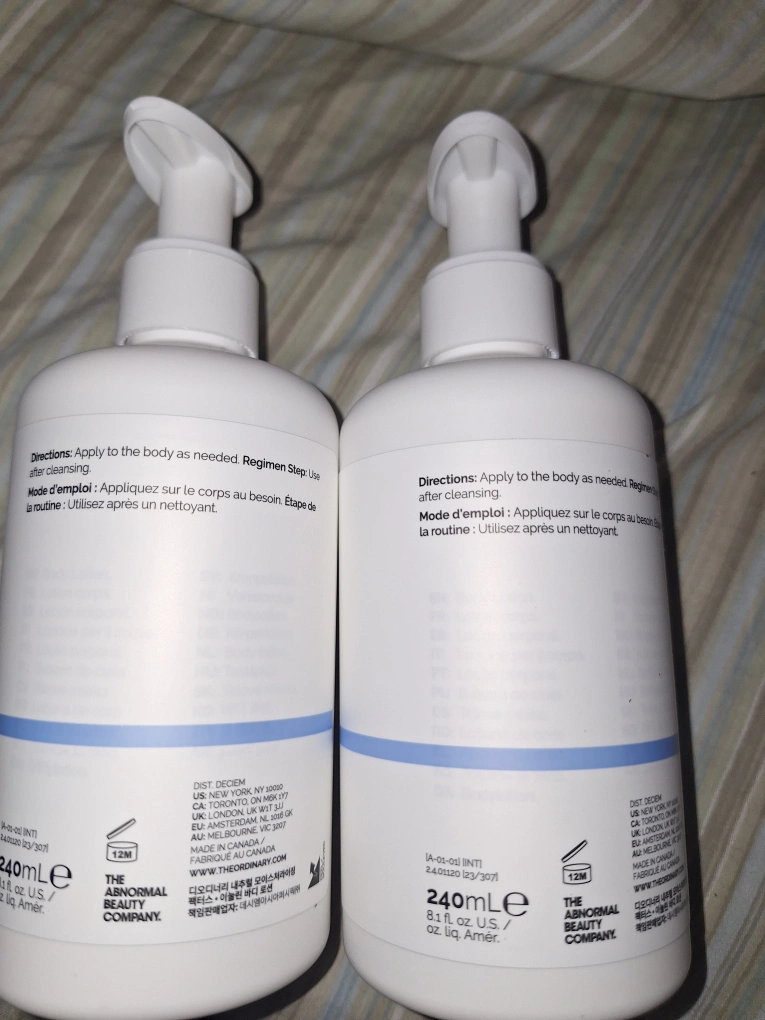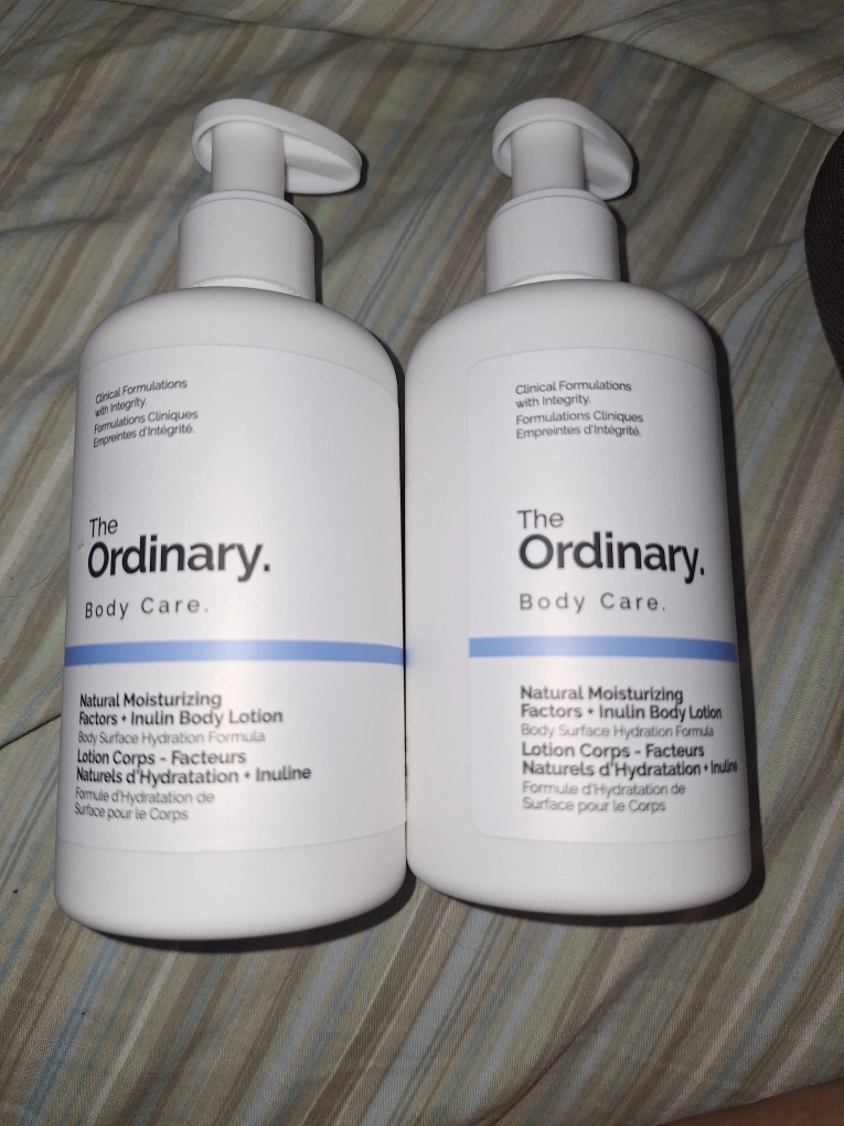 I'm selling two bottles of The Ordinary Natural Moisturizing Factors + Inulin Body Lotion. Each bottle contains 240mL/8.1 fl oz. U.S./oz. Liq. Amer. They're perfect for body surface hydration. Apply to the body as needed after cleansing. They're from The Abnormal Beauty Company!