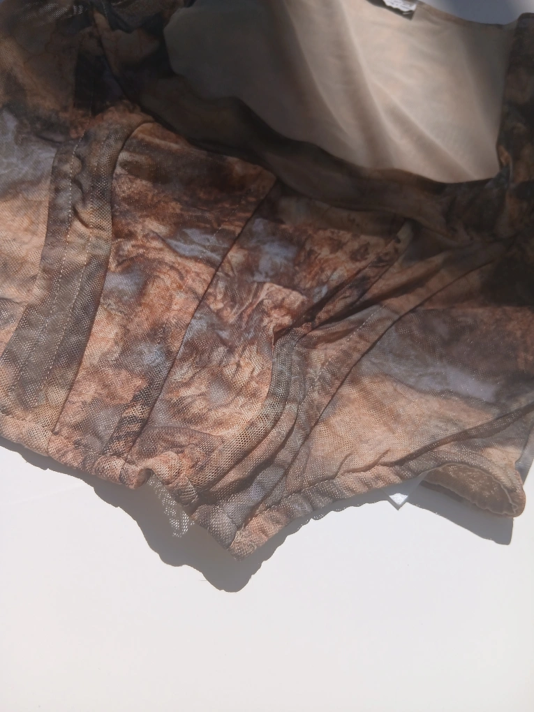 Here's a Bershka corset top with a unique marble print! It's a size small and has great stretch. Perfect for adding a stylish touch to any outfit.