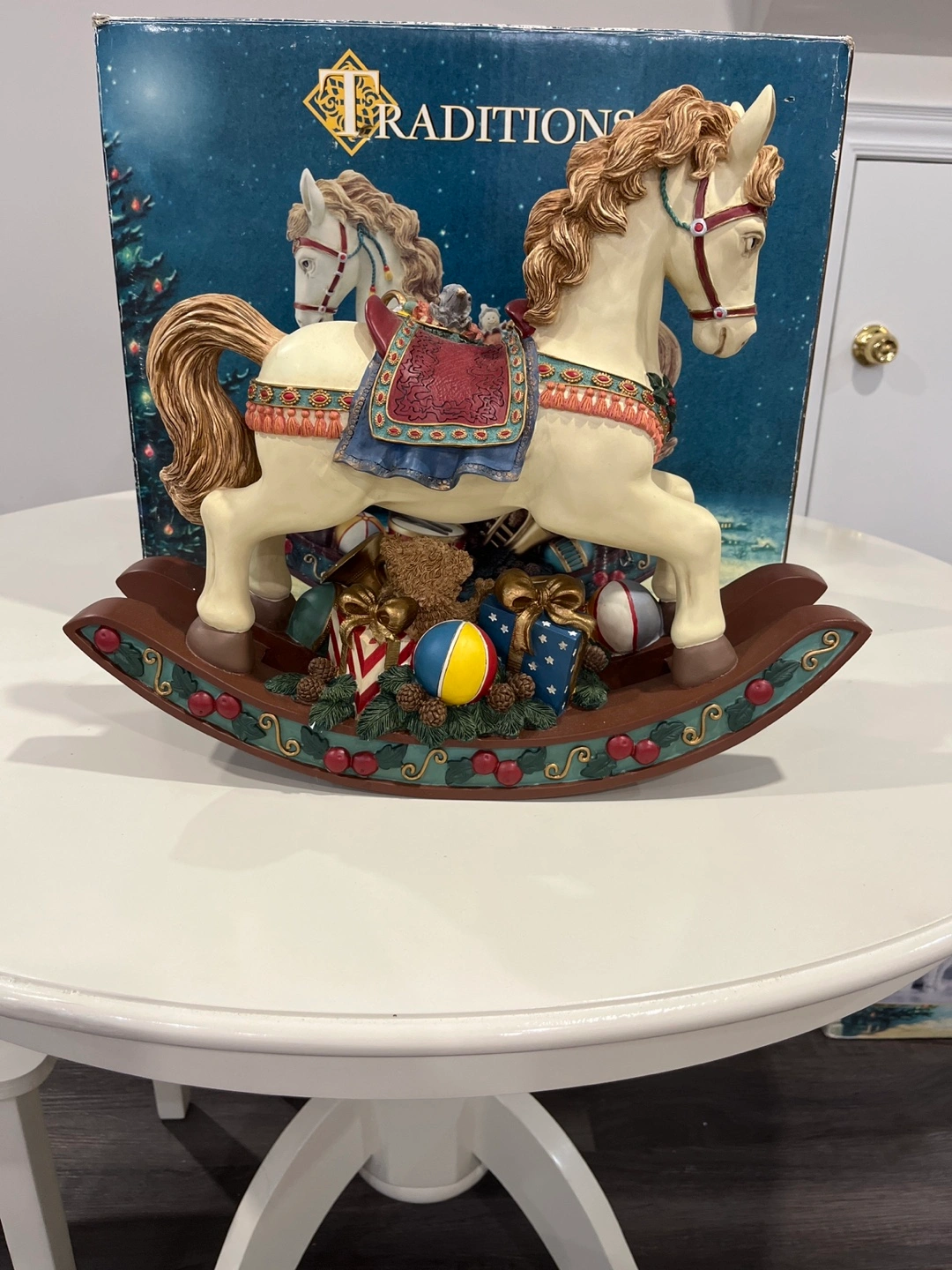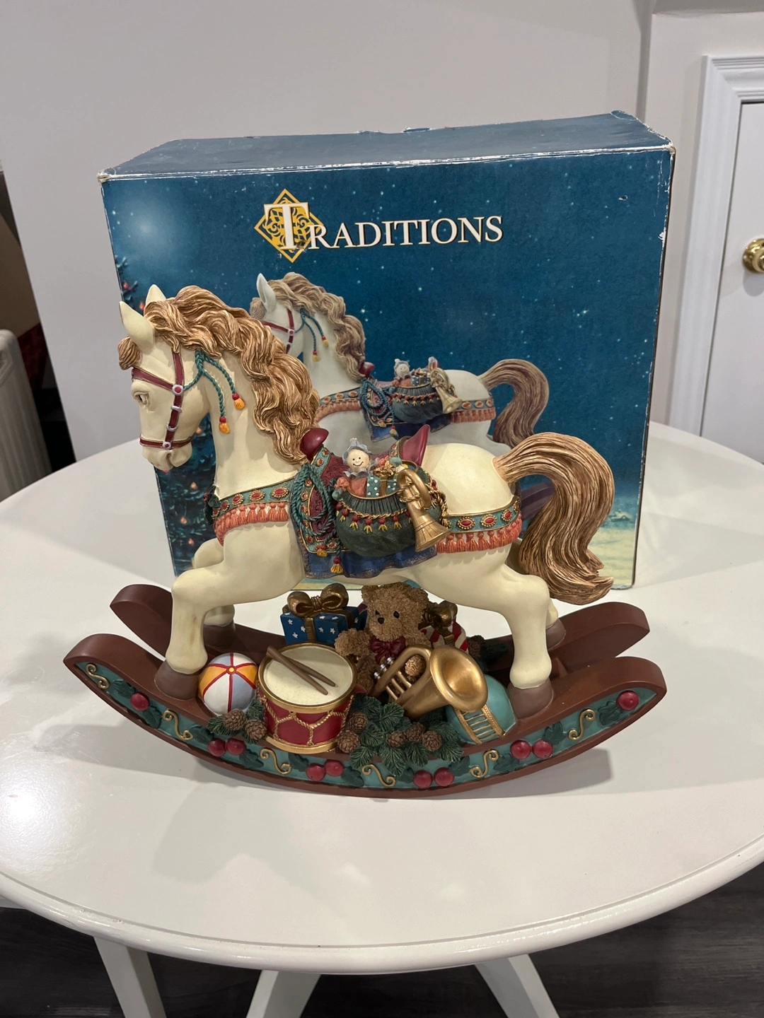 This is a beautiful Traditions rocking horse figurine, perfect for adding a touch of nostalgia to your home decor. It comes with its original box, making it great for gifting or storage. The horse is intricately detailed with festive decorations, including a teddy bear, drum, and presents. A charming addition to any collection. OPEN TO OFFERS!