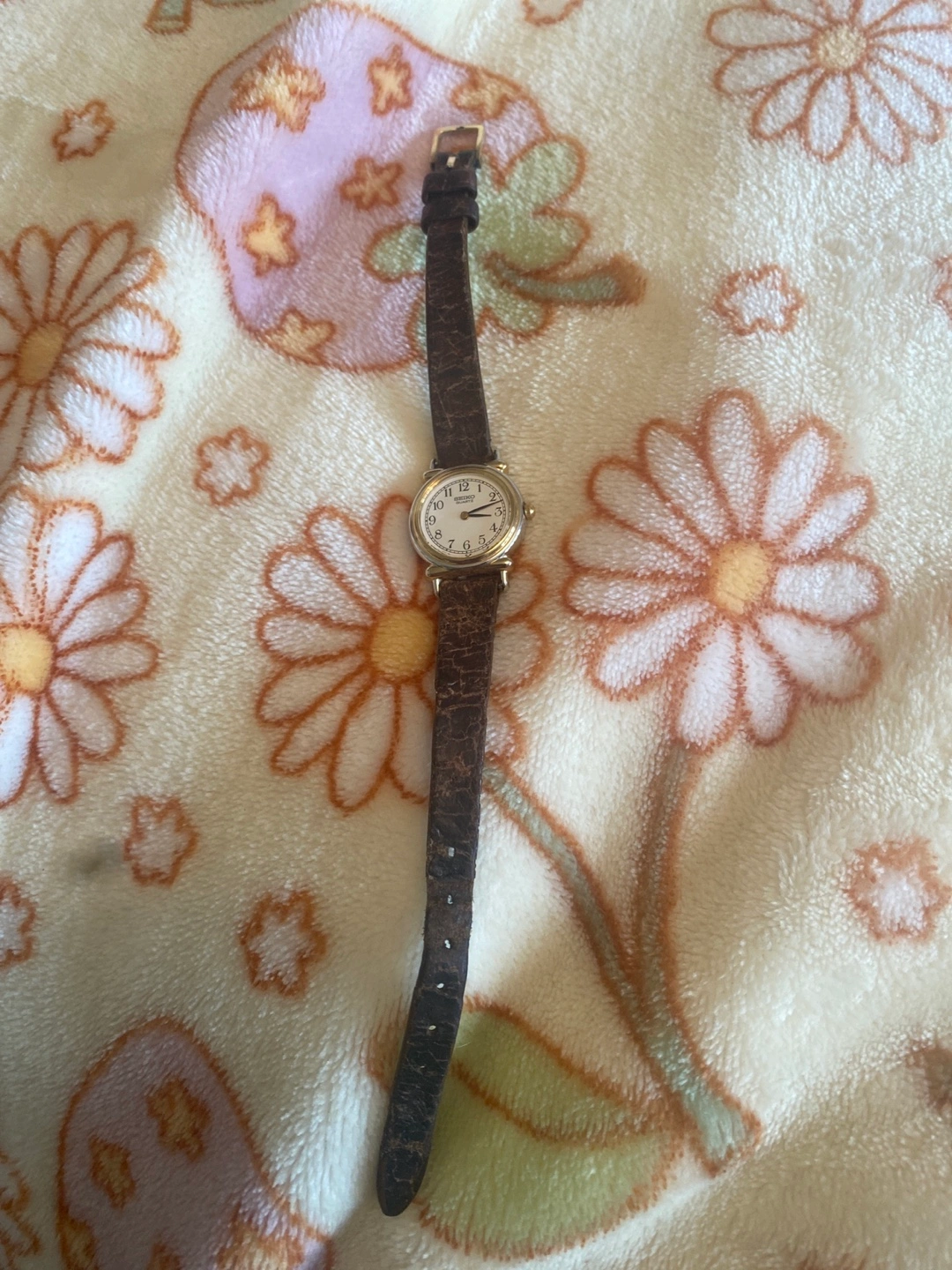 Selling a Seiko ladies watch. It has a brown leather strap and a gold-tone face. The strap shows some wear, but the watch face is in good condition. It's a classic and stylish timepiece!