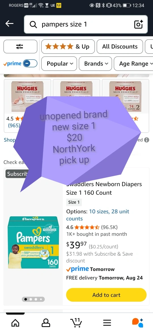 I have a brand new, unopened box of Pampers Swaddlers diapers in size 1. It contains 160 diapers. These are perfect for newborns! Retails for $39.97
