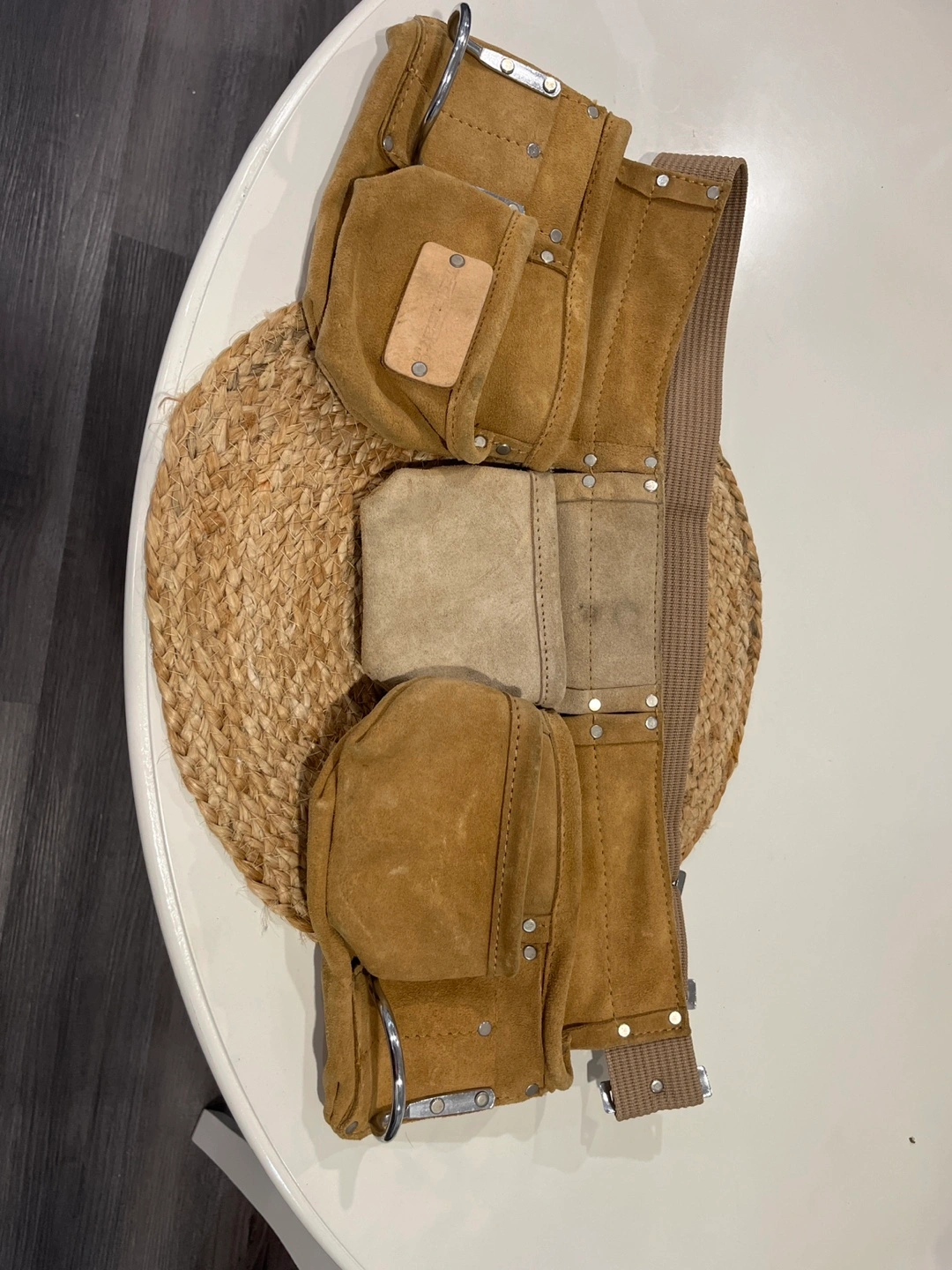 Here's a MasterCraft brown suede/leather tool belt. It shows some signs of use, but it's still in good condition and ready to help with your projects!
