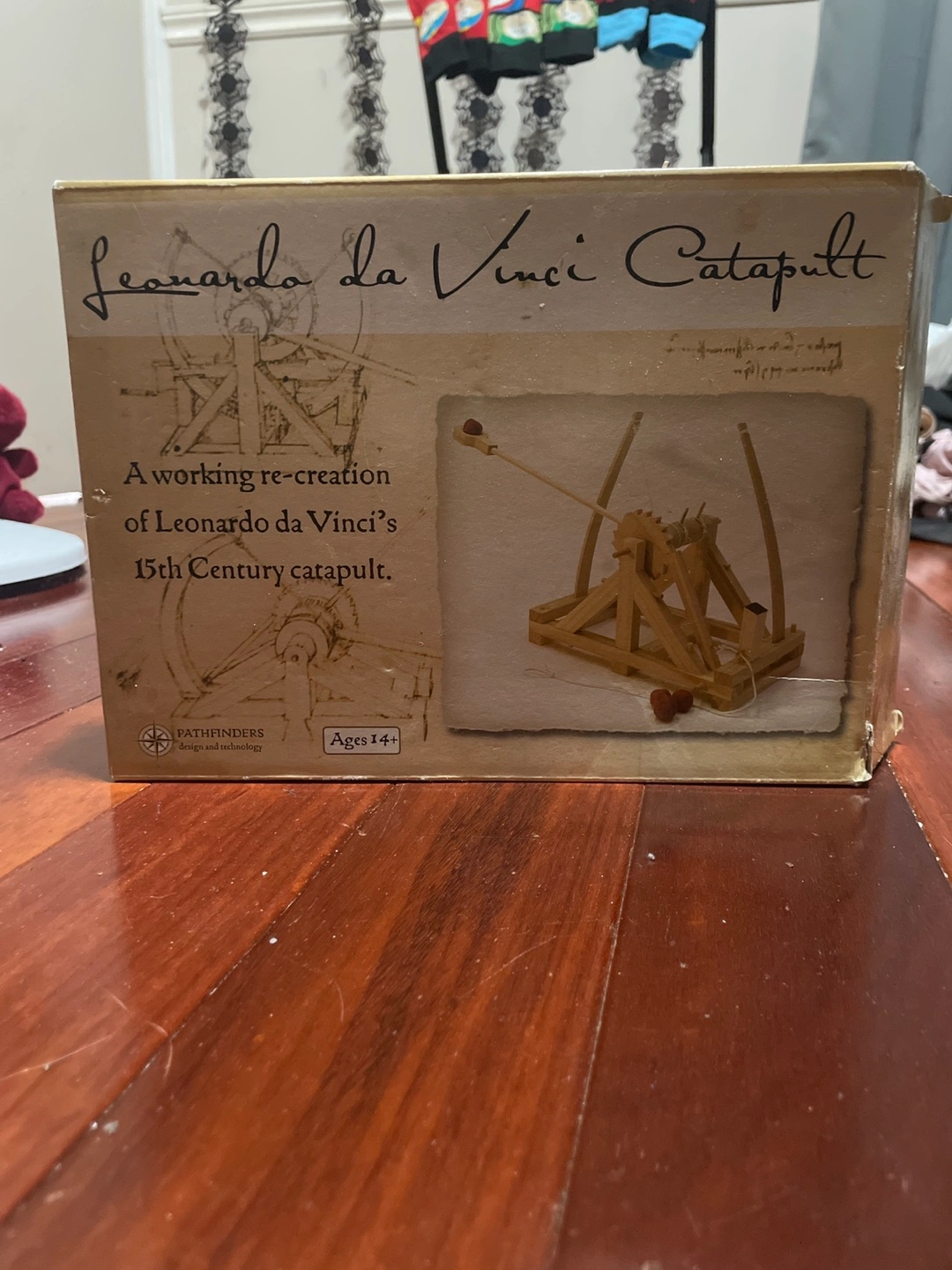 Build your own working re-creation of Leonardo da Vinci's 15th-century catapult! This kit is designed for ages 14+ and provides a fun project from one of the great minds of history. The catapults were first invented in Ancient Greek and Roman times, however, our common idea of them is based on drawings we have from the Medieval Ages. Easy to make in about an hour with natural untreated wood! All pieces are pre-cut and ready to go, and parts are pegged for extra strength