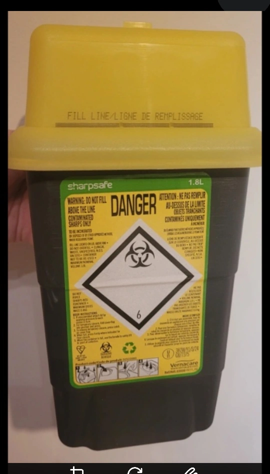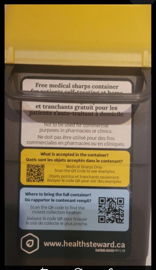 Free medical sharps container for patients self-treating at home. This container is designed for the safe disposal of medical sharps, such as needles and lancets. It's intended for personal use.