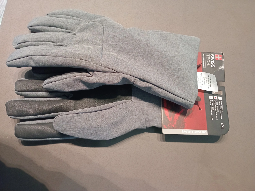 Selling a brand new pair of Swiss Tech softshell gloves, size L/XL! These gloves are waterproof and breathable, perfect for keeping your hands warm and dry. They also feature touchscreen compatibility so you can use your devices without taking them off