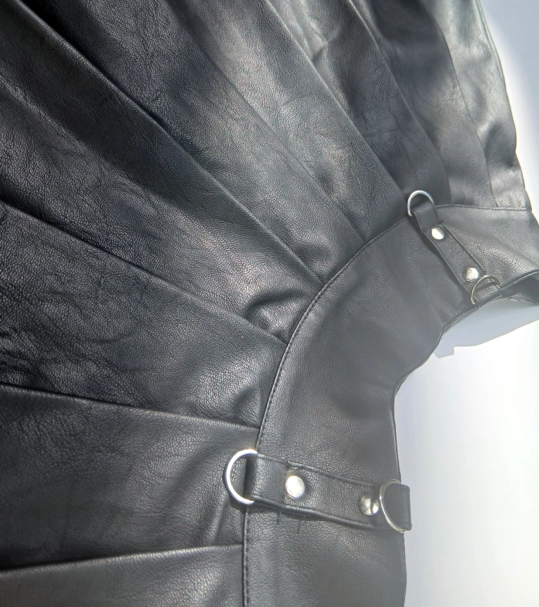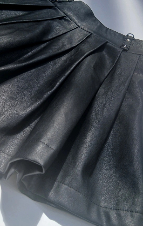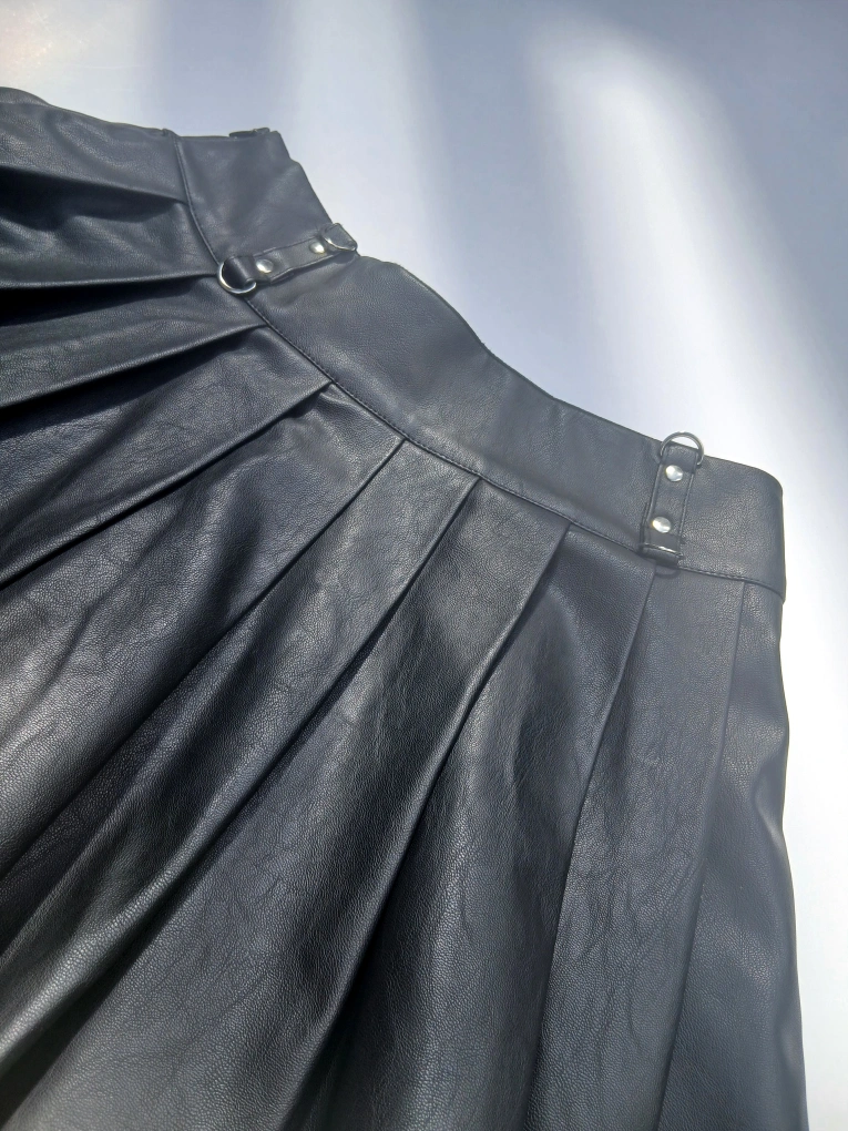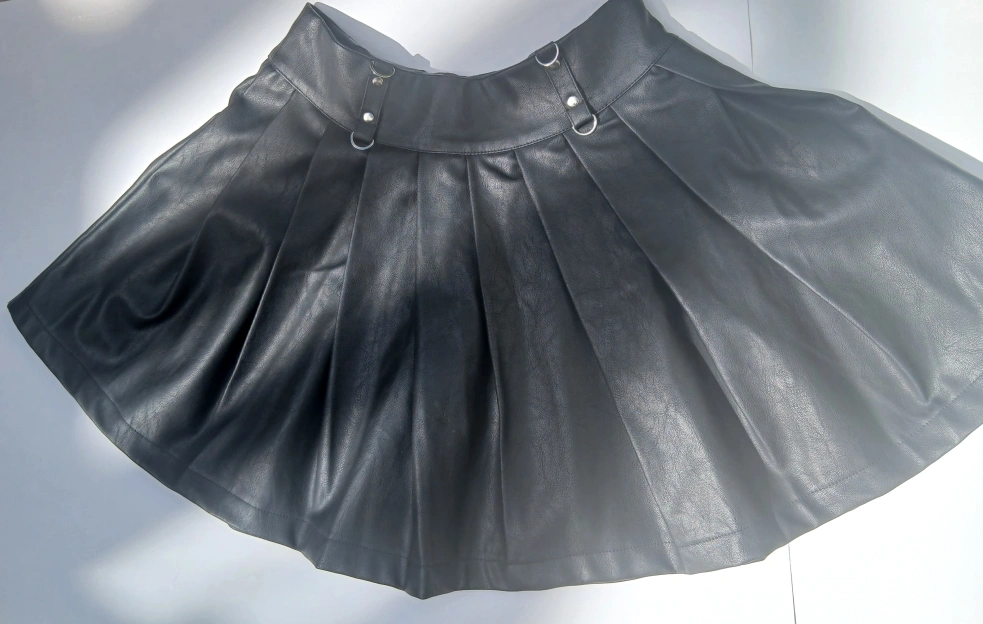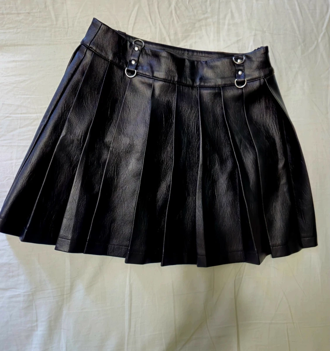 Selling a Forever 21 black faux leather mini skirt in size small. This skirt features a pleated design and silver hardware accents.