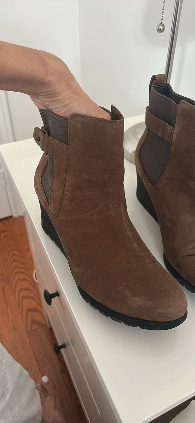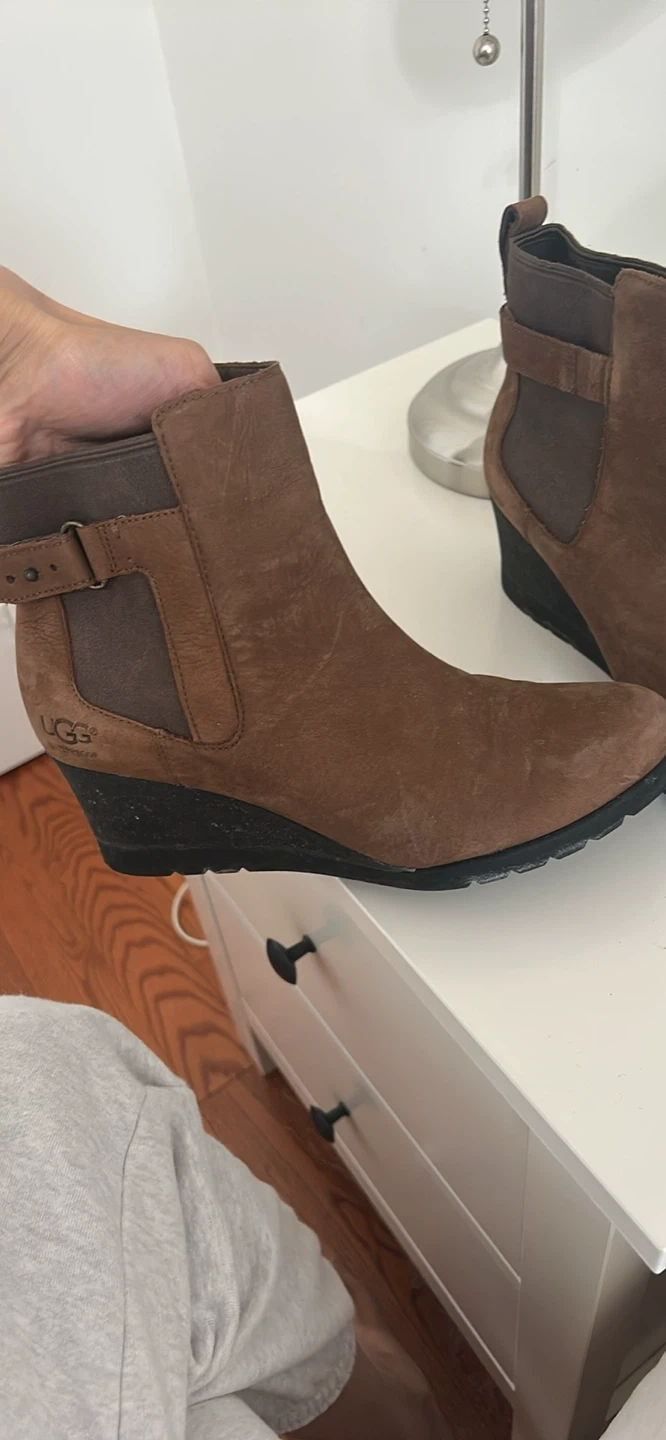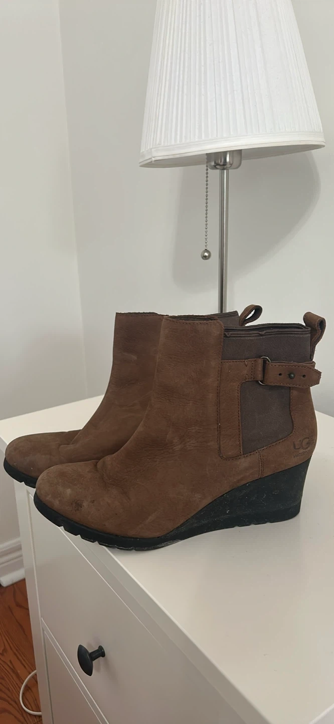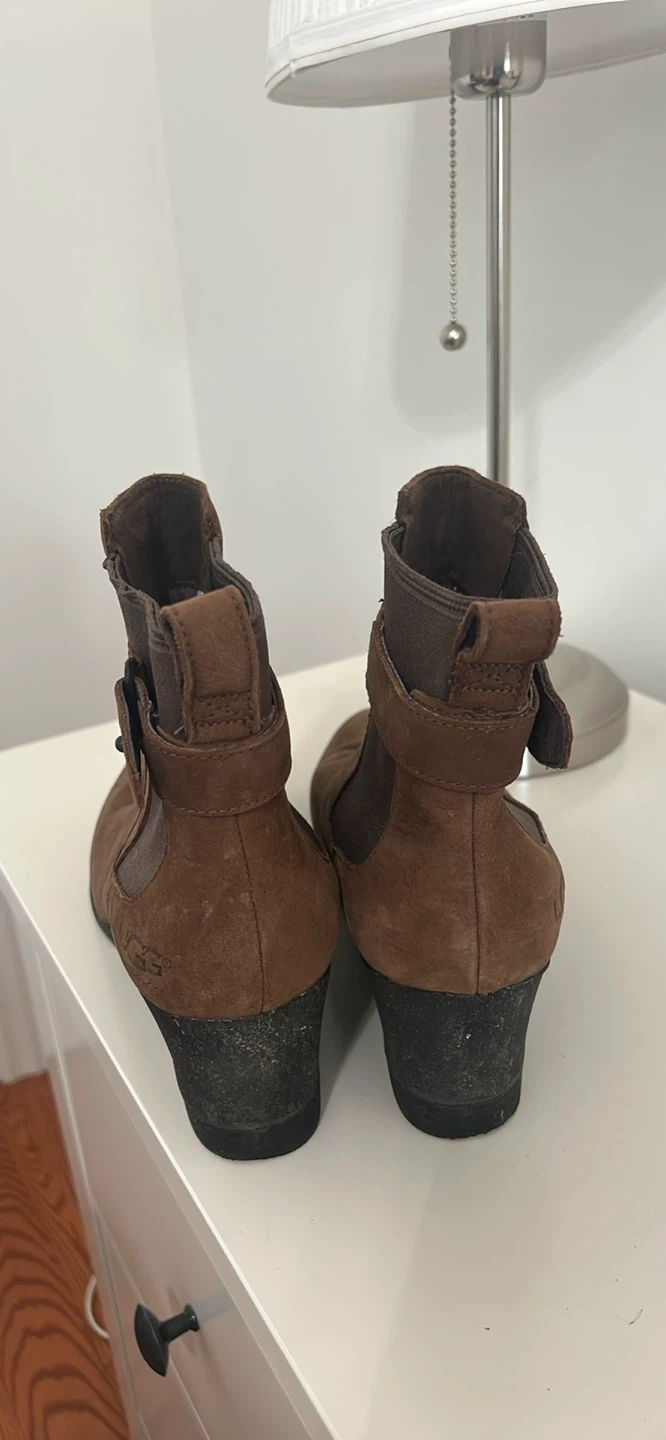 Selling a pair of UGG ankle boots in a lovely brown leather. They're a comfortable wedge style and size 7. Perfect for adding a bit of style to your everyday wear! Heeled chelsea boots barely worn only a few times. Heeled Chelsea boots - great for the fall or winter.