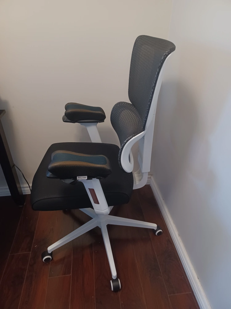 Selling my Ergonomic Office Chair with removable arm rest cushions. It's in great condition and super comfy for long work days, even at home. The chair is black and has a sleek, modern design that fits well in any space.