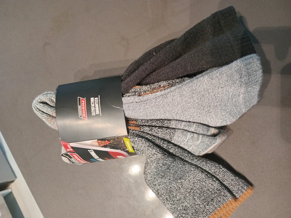 Here's a pack of three pairs of Dickies Steel Toe Crew Performance Thermals. These socks are a wool blend and are designed for maximum warmth without bulk. They are a size 6-12 and are midweight. Perfect for keeping your feet warm and protected!