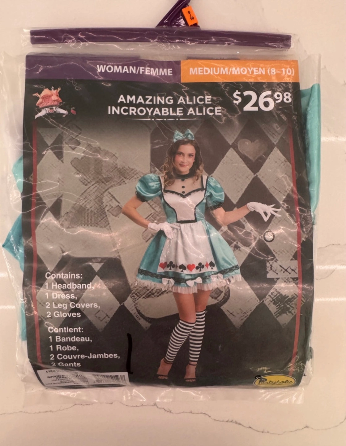 HALLOWEEN COSTUME- WOMAN MEDIUM (8-10) AMAZING ALICE COSTUME BRAND NEW includes: 1 headband, 1 dress, 2 leg covers, 2 gloves PICKUP IN COURTICE NEAR HWY 2 AND COURITCE RD all sales are final