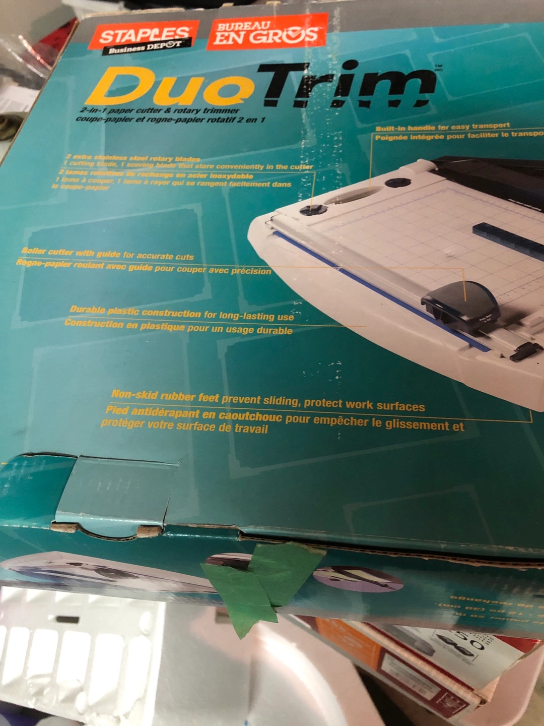 Selling a Staples DuoTrim 2-in-1 paper cutter and rotary trimmer. It has a built-in handle for easy transport and non-skid rubber feet to prevent sliding. The stainless steel blade stays sharp and strong. It also has a soft grip handle for cutting comfort