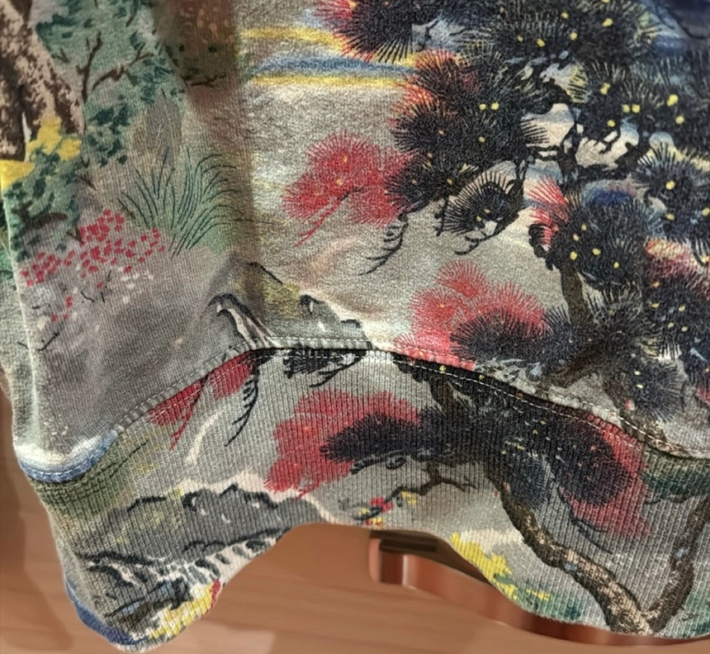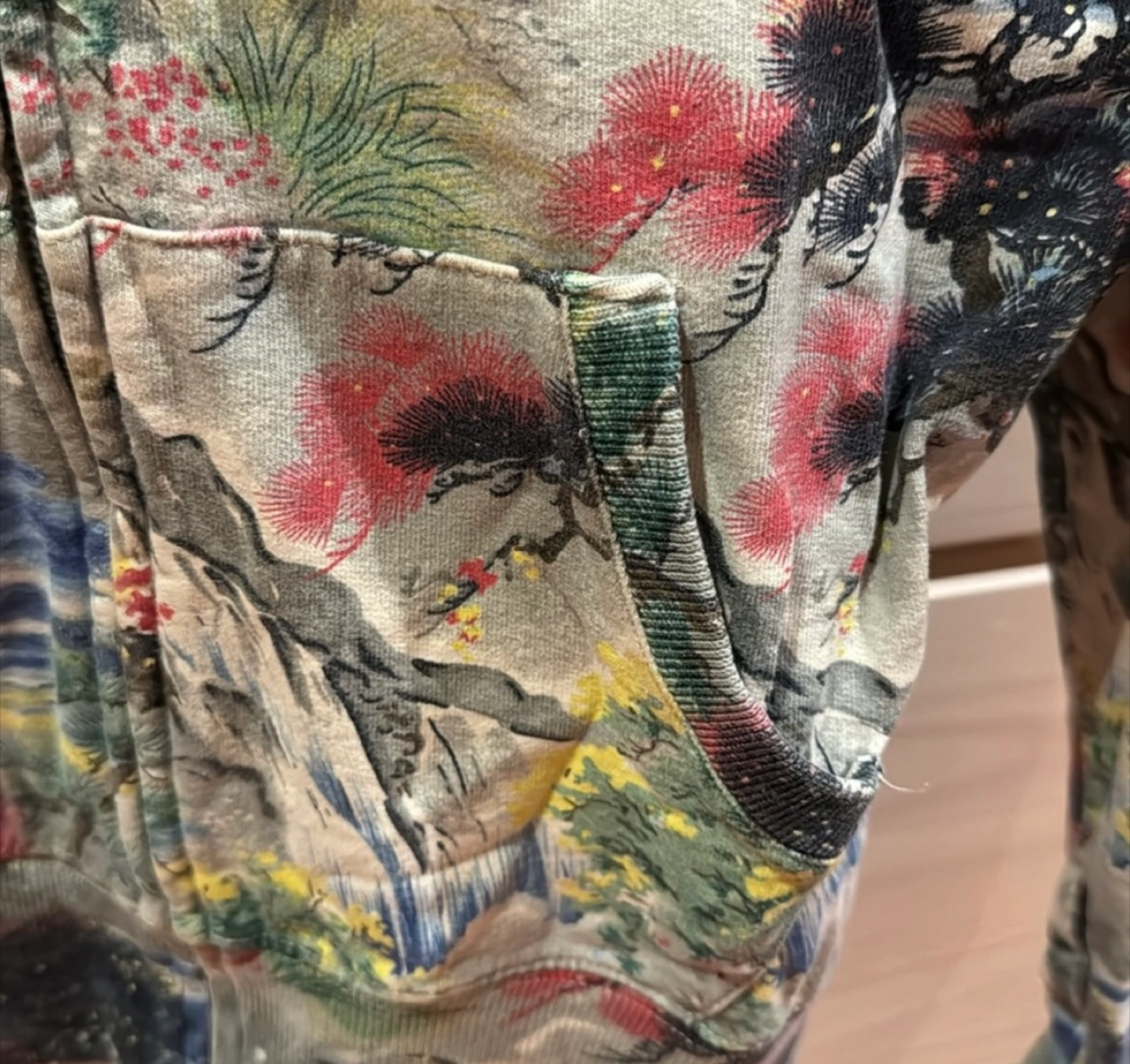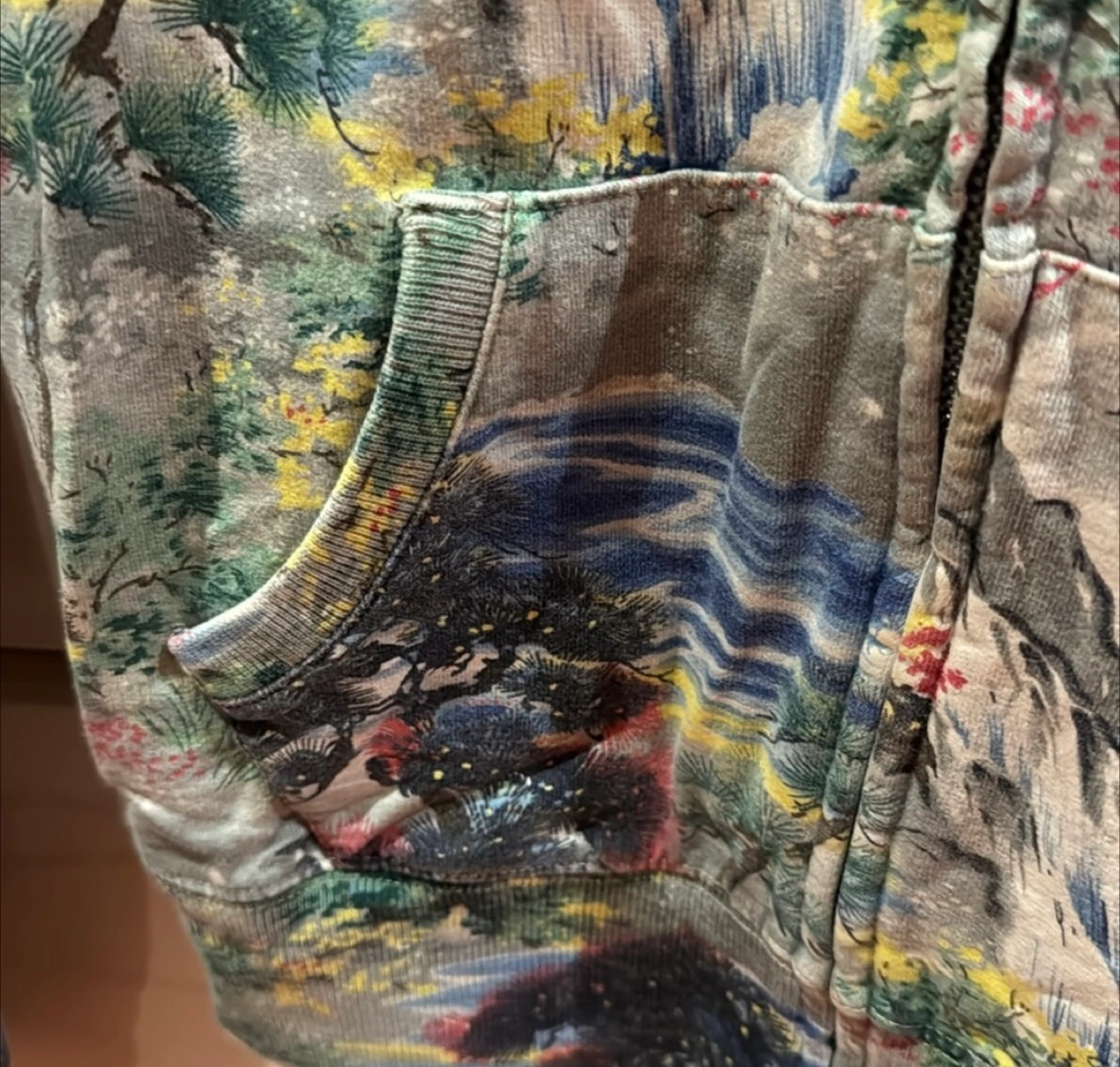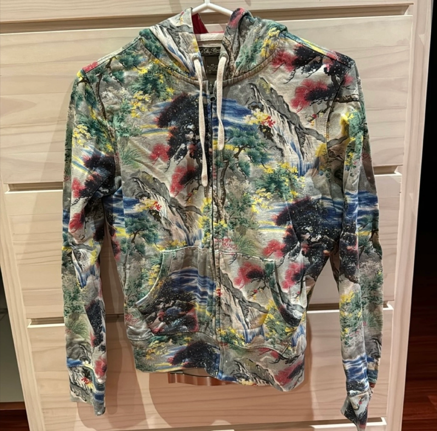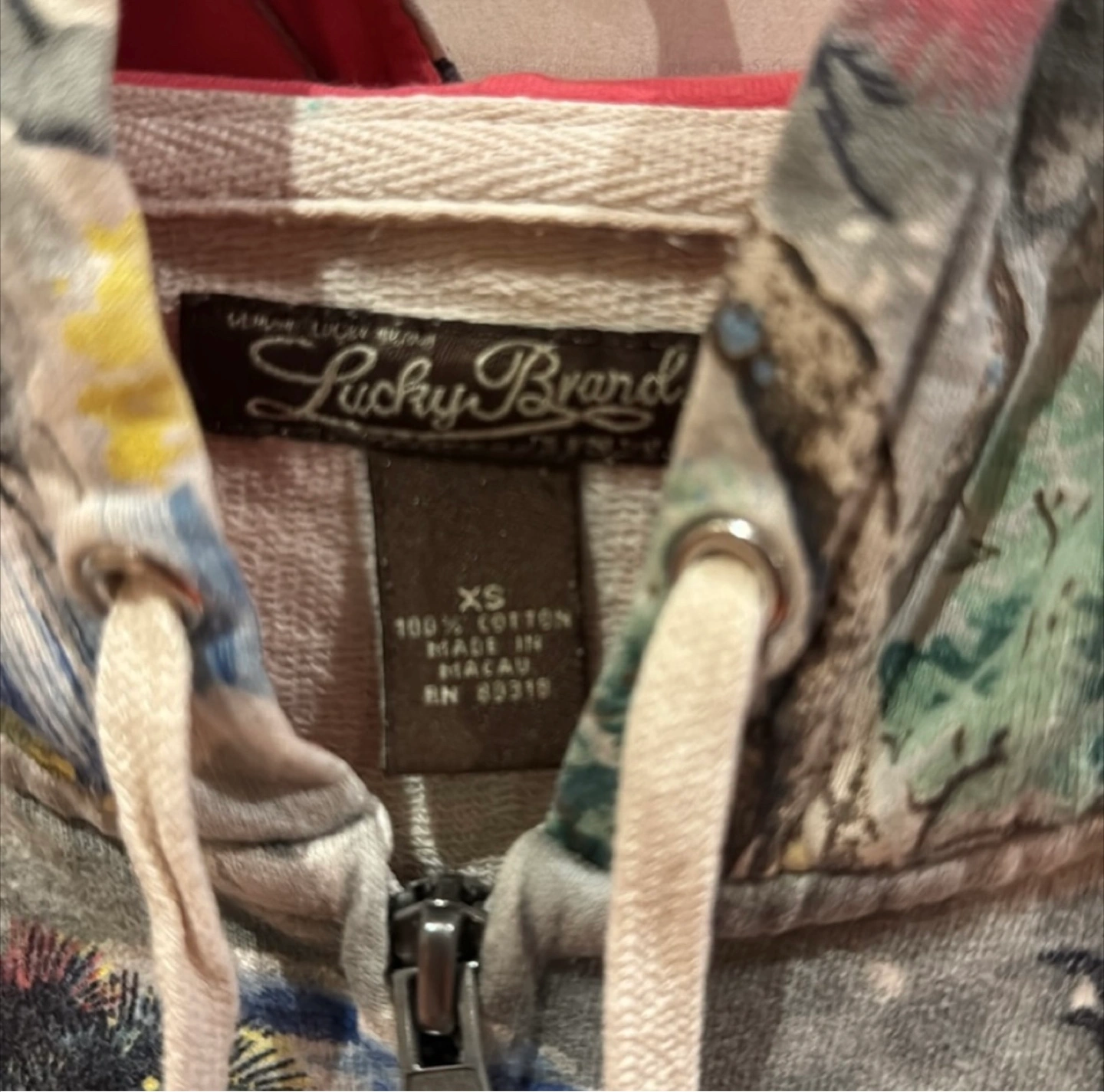 This is a Lucky Brand full zip hoodie in size XS. It features a unique landscape pattern and is made of 100% cotton. Perfect for layering or wearing on its own!