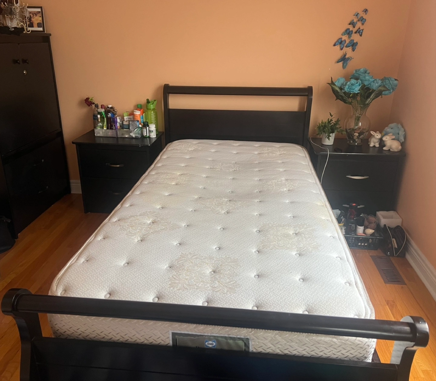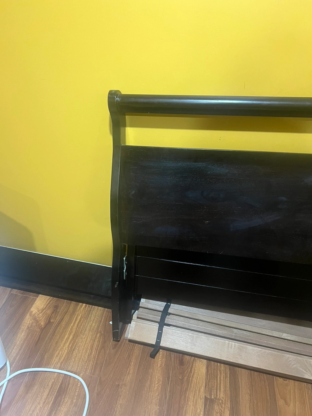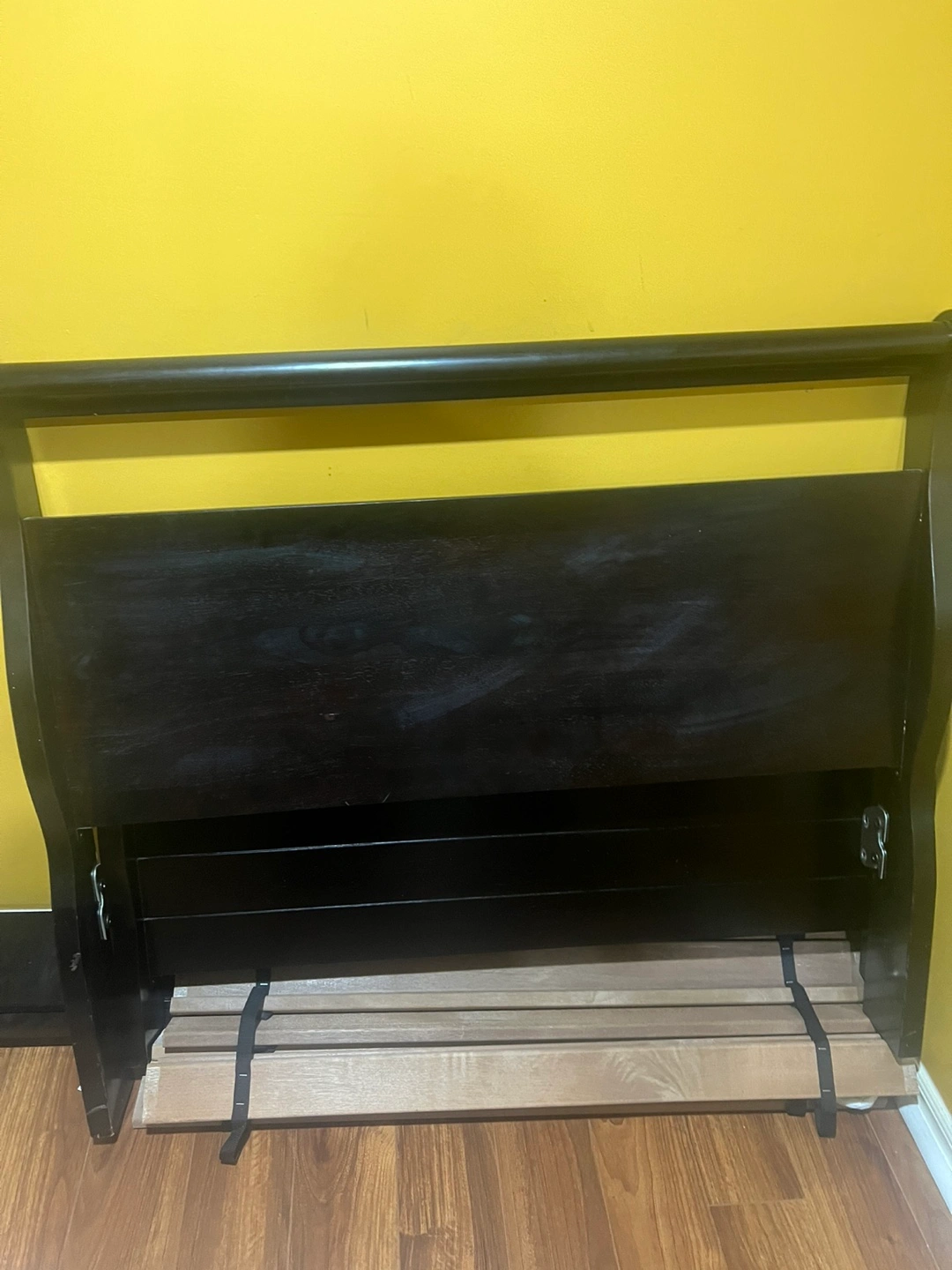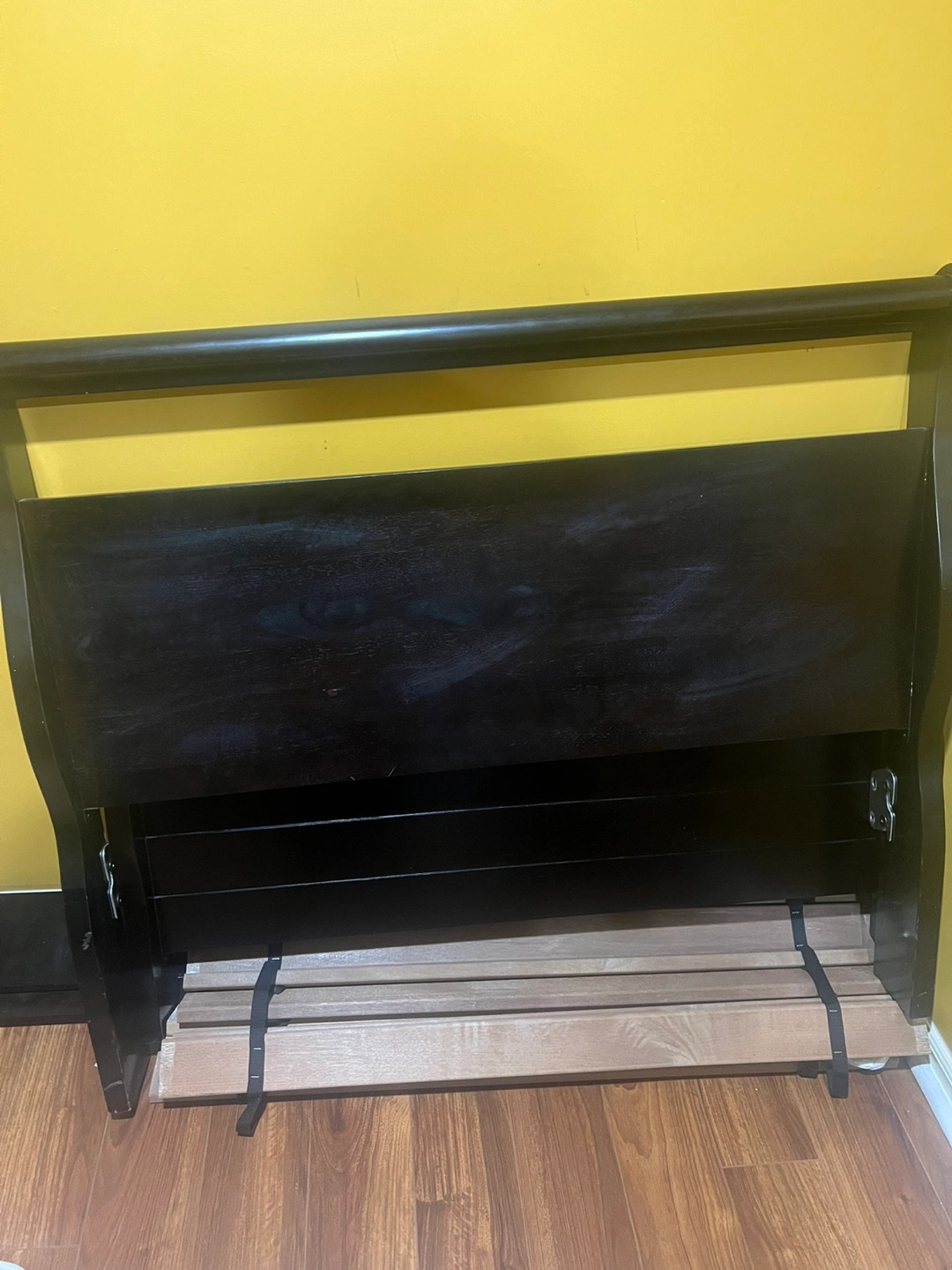 Selling a dark wood bed frame! It's in good condition and would look great in any bedroom. The frame is sturdy and ready for a new home. The bed is dissembled but is exactly same as the picture with mattress. I am only selling the bed, no mattress. Please message if you're interested!