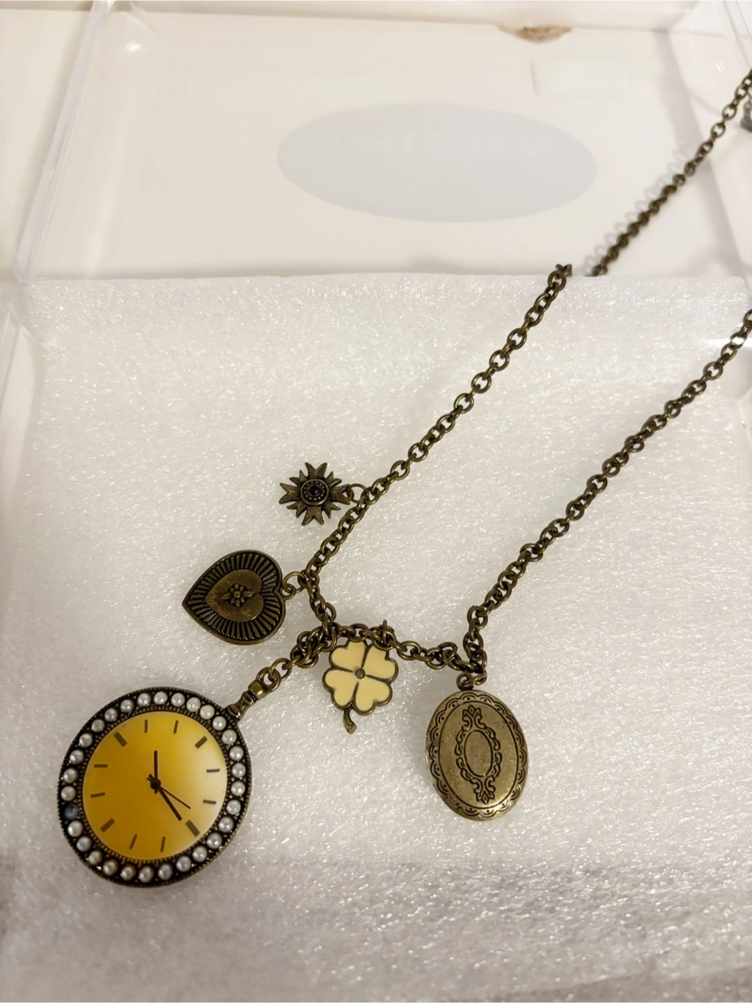 Check out this charming vintage-style necklace! It features a unique clock pendant with a yellow face, along with other cute charms like a clover and a heart. The chain has an antique bronze finish, giving it a lovely, timeless look. Perfect for adding a touch of whimsy to any outfit! Free with any purchase that is $10 or more (or total of $10+)
