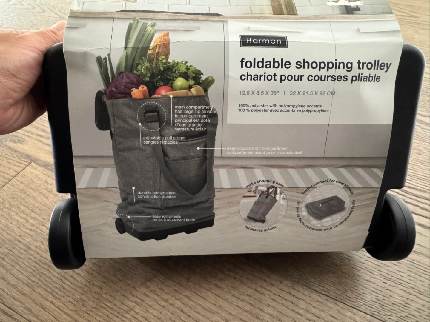 This Harman foldable shopping trolley is perfect for your grocery runs! It's a chariot pour courses pliable, making shopping easy and storage compact. - Dimensions: 12.6 x 8.5 x 36 inches (32 x 21.5 x 92 cm) - Made with 100% polyester with polypropylene accents - Features a main compartment with a large zip closure, adjustable pull straps, and an easy-access front compartment - Durable construction with easy roll wheels