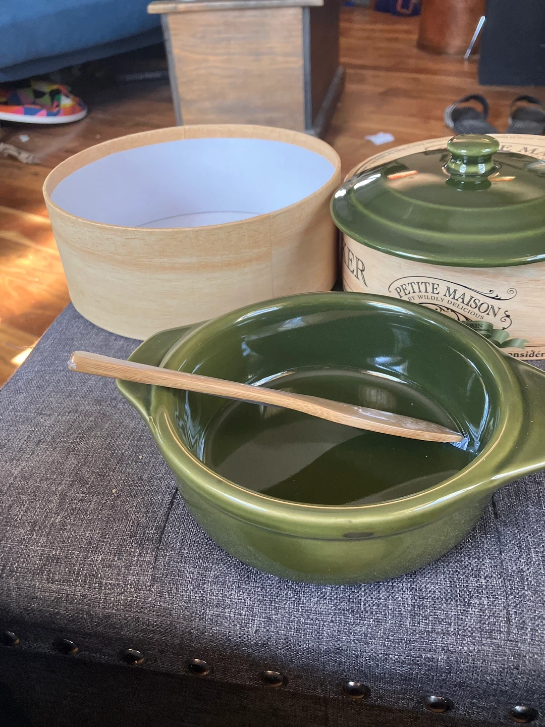 Selling a Petite Maison Brie Baker by Wildly Delicious! Rosemary colour. It comes with its original box. This ceramic baker is ideal for baking Brie, Camembert, and other fine cheeses. It's dishwasher, oven, and microwave safe!