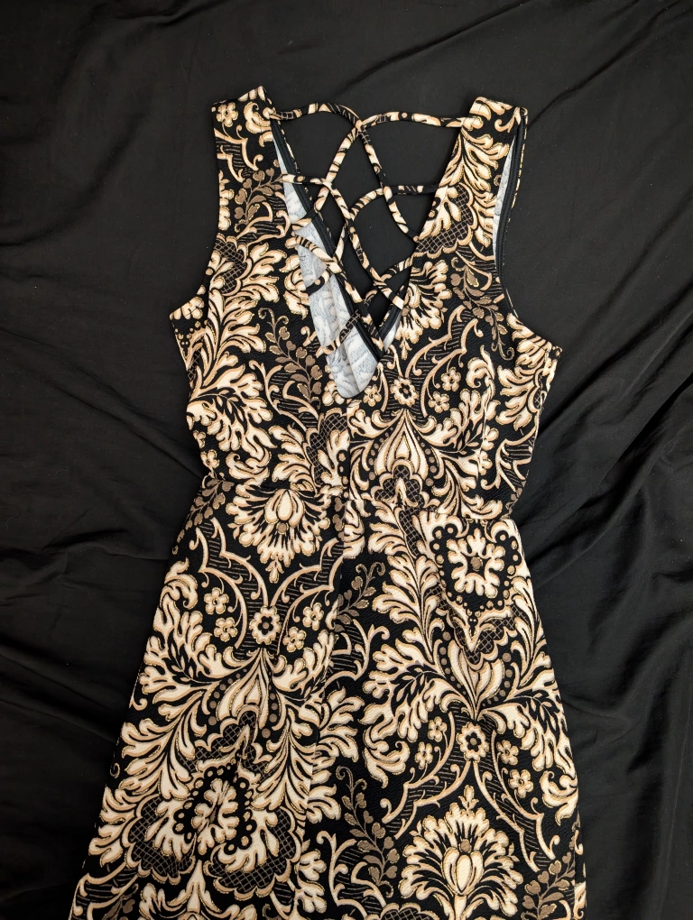 Selling a dress with a black and beige pattern. It features a unique criss-cross back design. Perfect for a night out or a special occasion!
