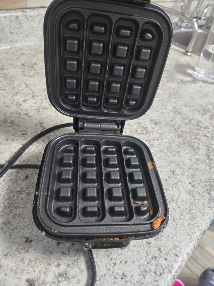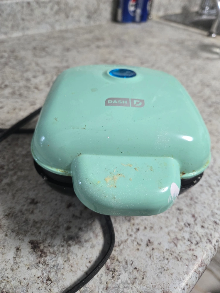 Selling a DASH mini waffle maker in aqua. It's perfect for making single-serve waffles, and it heats up quickly. It does show some signs of use, but it still works great!