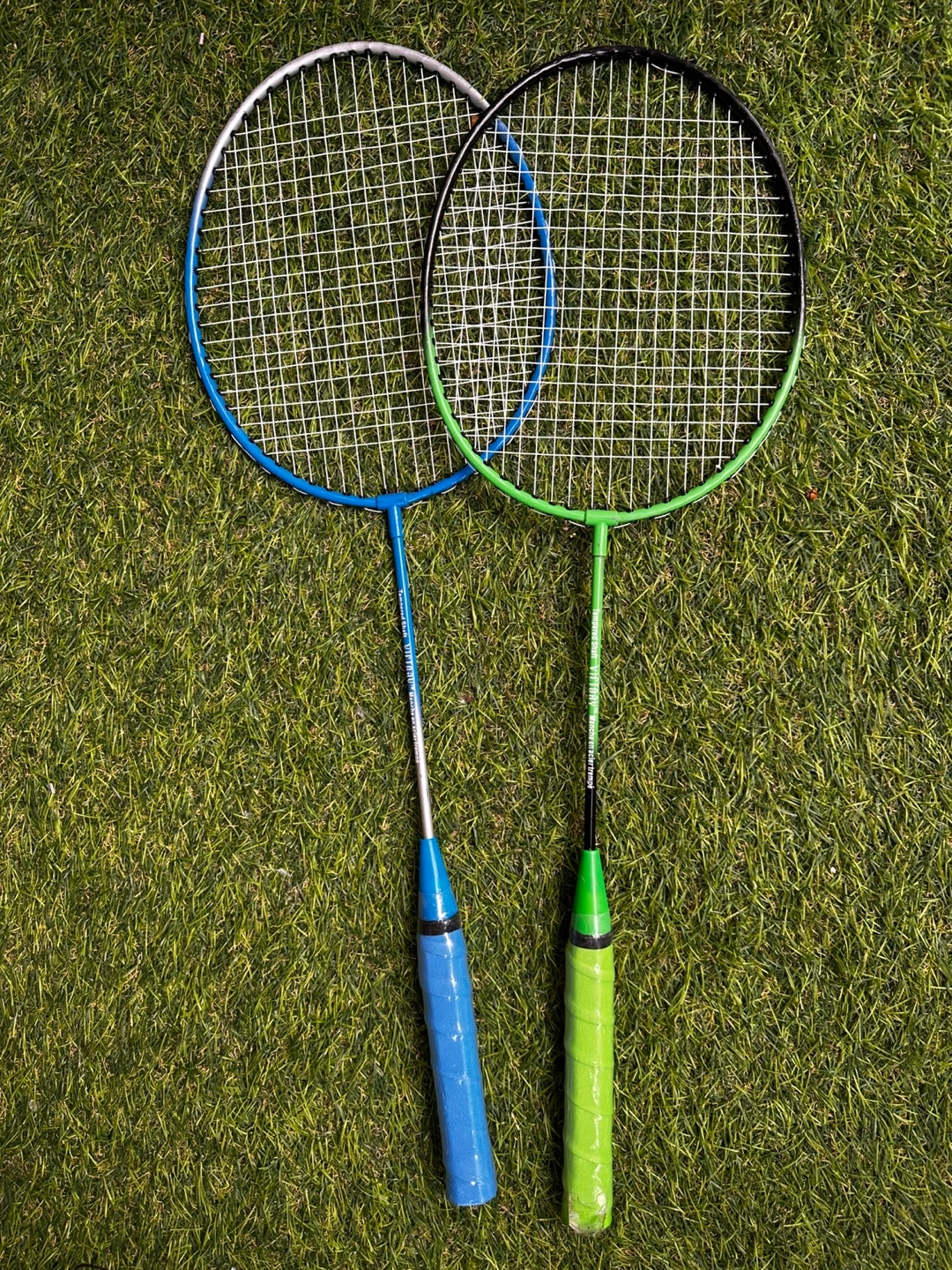 Selling a set of two badminton rackets! One has a blue frame and handle, and the other has a green frame and handle. Perfect for some fun in the backyard or at the park! $2each