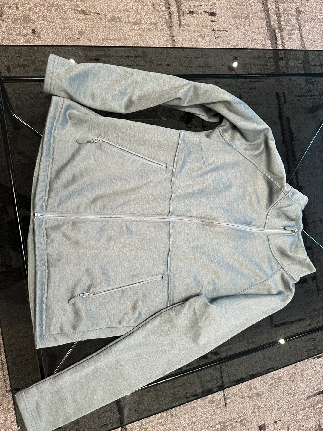 Selling a comfy grey zip-up jacket! It's in great shape and ready for a new home. Perfect for layering or wearing on its own during those in-between weather days
