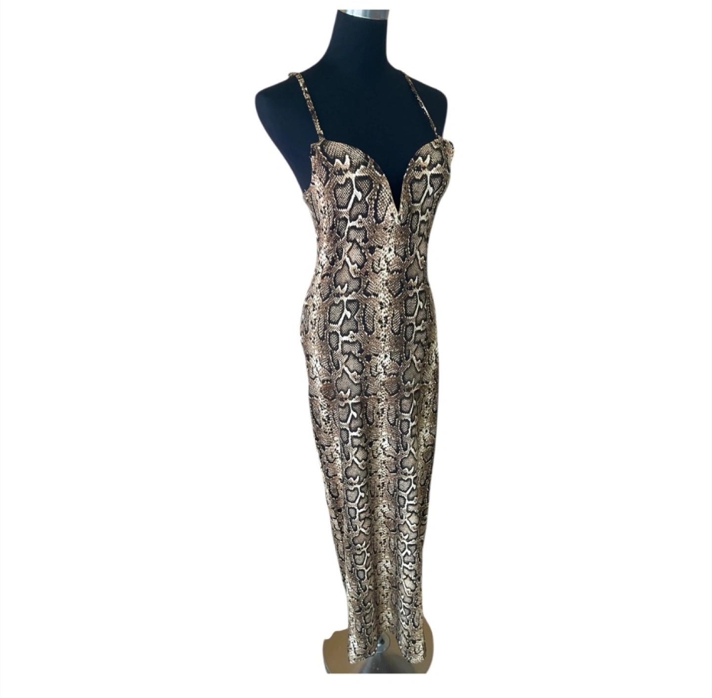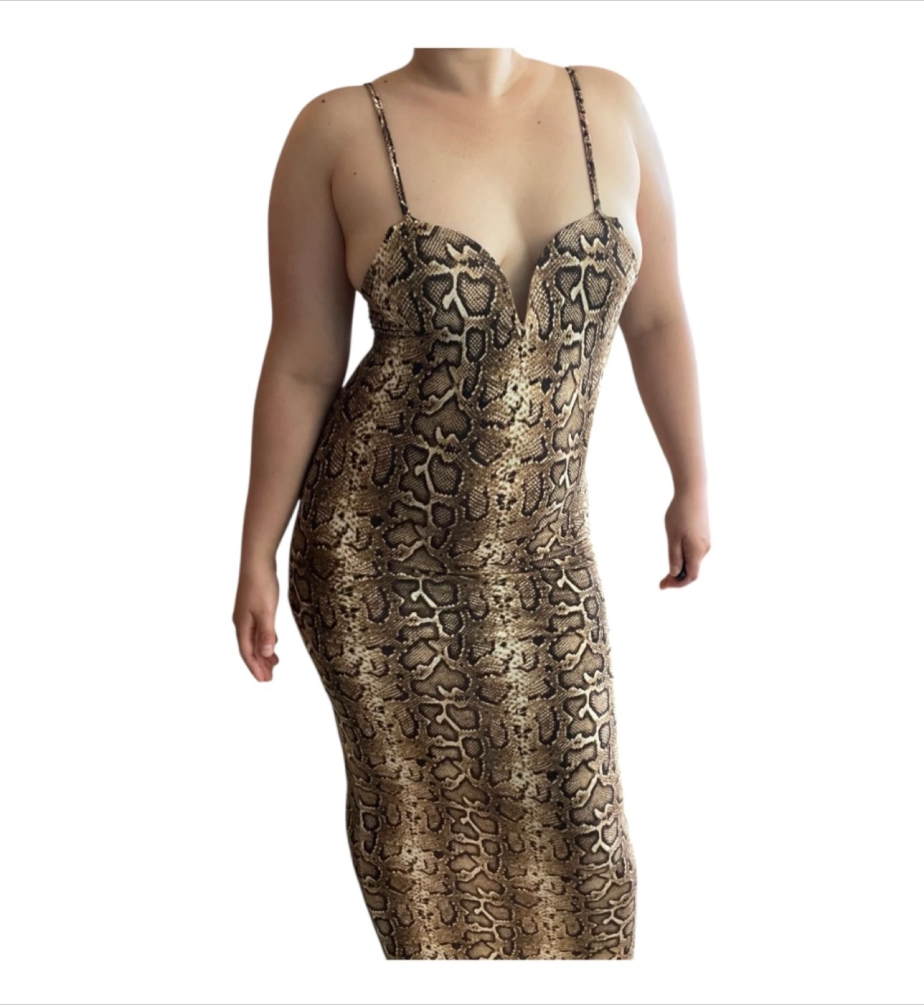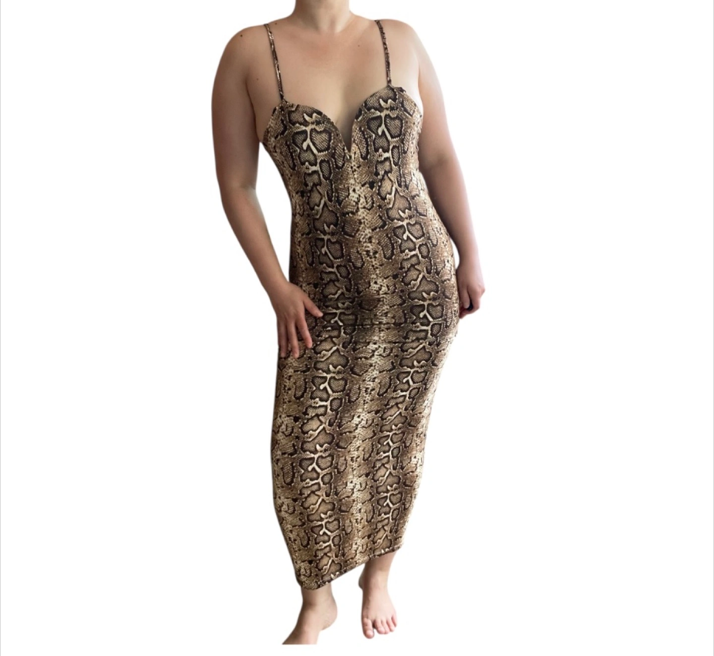 Vintage 2000s Y2K Style Brown Snakeskin Print Spaghetti Straps Bodycon Maxi Dress S/M 💎RARE FIND! ✅CERTIFIED AUTHENTIC VINTAGE LATE 90s & EARLY 2000s ✨VERY Y2K STYLE! Condition: 10/10. No Stains/Rips/Tears. Style Details: Bodycon slip dress Thin spaghetti straps Low cut sweetheart neckline with top underwire to keep the shape of the V collar Sleeveless Length: maxi Pattern: snakeskin Colour: brown & tan shades Lightweight, silky flowing fabric - soft & breathable Bodycon fitted silhouette Versatility: casual or dress up Minimalist & chic look Measurements (Inches): **Mannequin size medium **Clothing measured on flat surface - ONLY LEFT TO RIGHT - NOT ALL AROUND CIRCUMFERENCE Tag Size: Small/Medium Shoulder to shoulder: 8 Bust: 18 Waist: 14 Hips: 20 Armpit Width: 10 Length from shoulder to bottom hem: 52